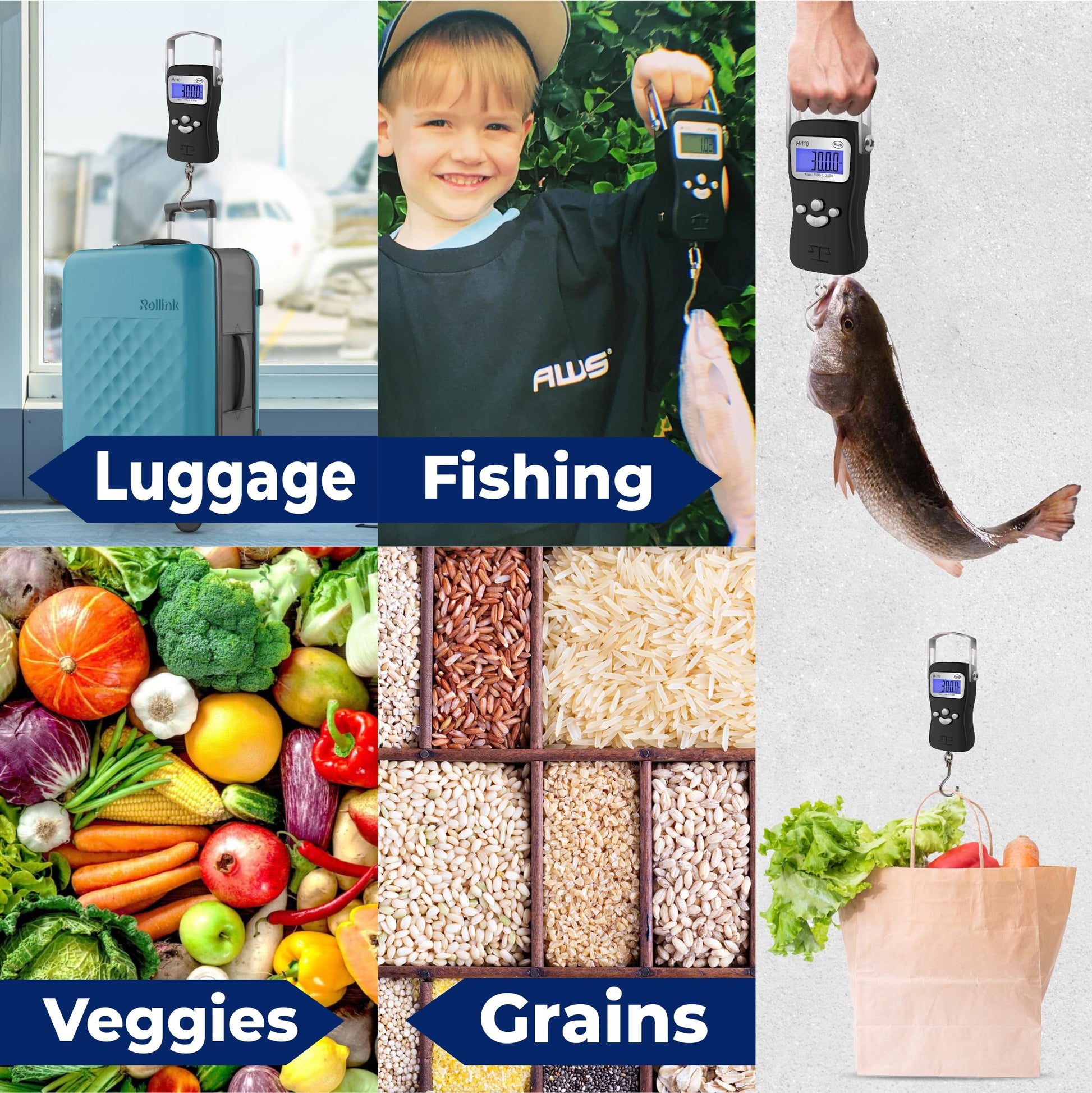 AWS Digital Luggage Scale, Fish Weighing Scale, Hanging Scale 110lb/50kg – Die-Cast Metal Construction, Built-in Tape Measure, Hook & Handle – for Travel, Fishing, Archery, Hunting, Outdoor (Black)