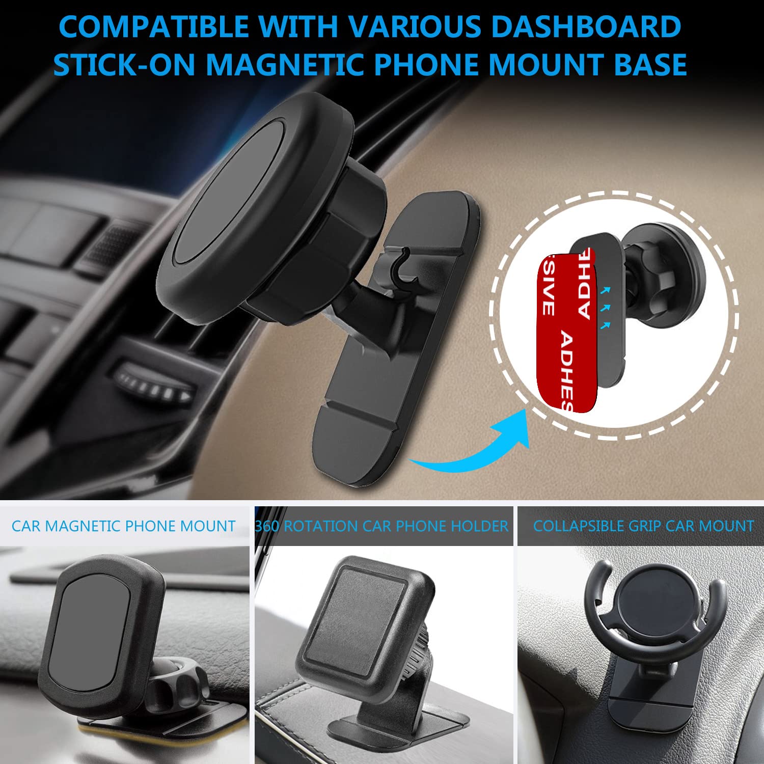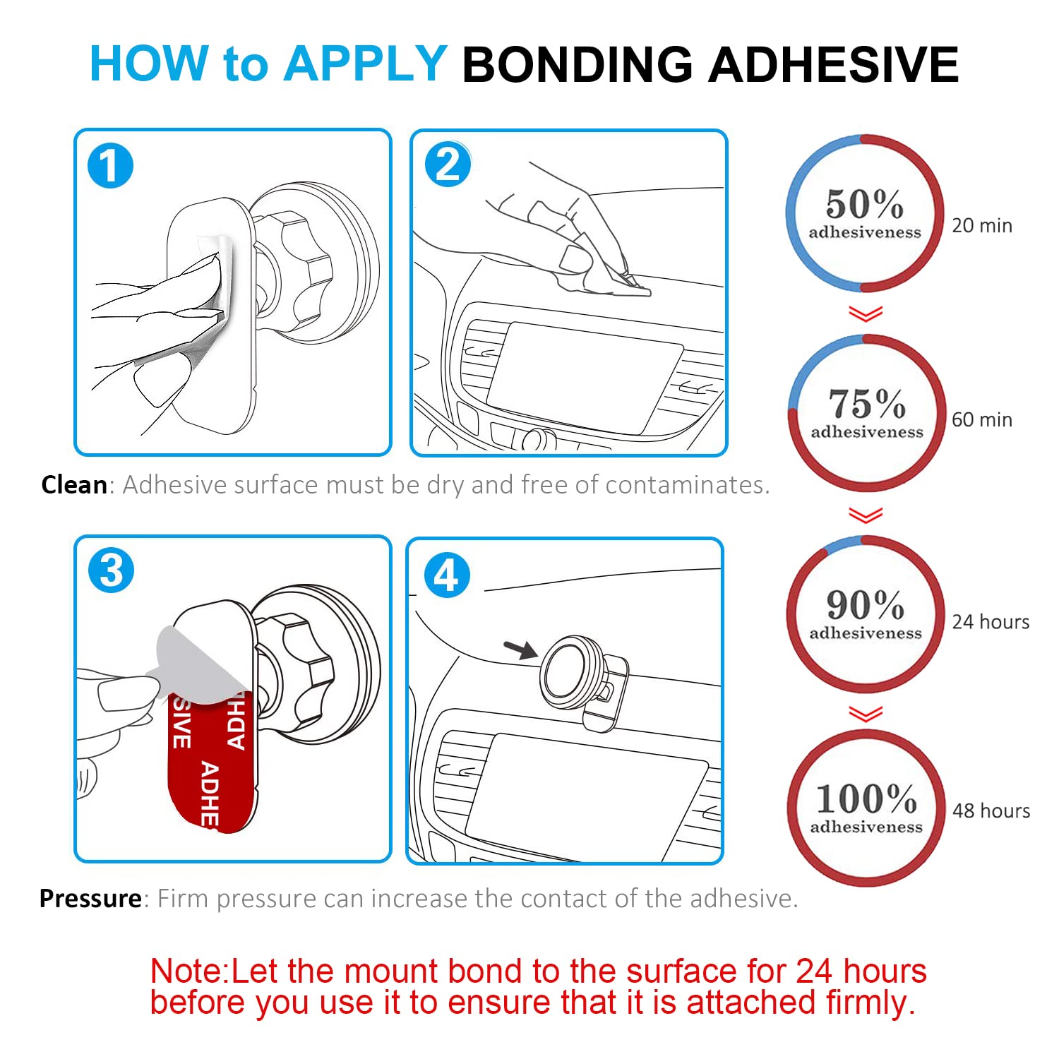 • 【Easy to Use】To maximize adhesive contact, please clean the adhesive surface before use and let it dry, free of contaminates. And wait at least 24 hours to use after stuck. First peel off the white side of the adhesive and stick it to the car mount base. After applying some pressure on the adhesive, peel off the red film side of the adhesive and stick the car mount to your dashboard.