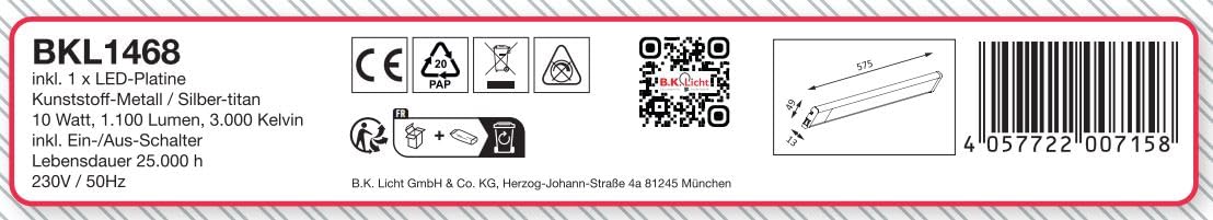 B.K.Licht - LED Strip with On/Off Switch, Warm White Light Colour, Includes Plug Cable, Under-Unit Light, Kitchen, LED Light Strip, Kitchen, Cabinet Lighting, Kitchen Lamp, 57.5 x 4.9 x 1.3 cm, Titanium-Coloured