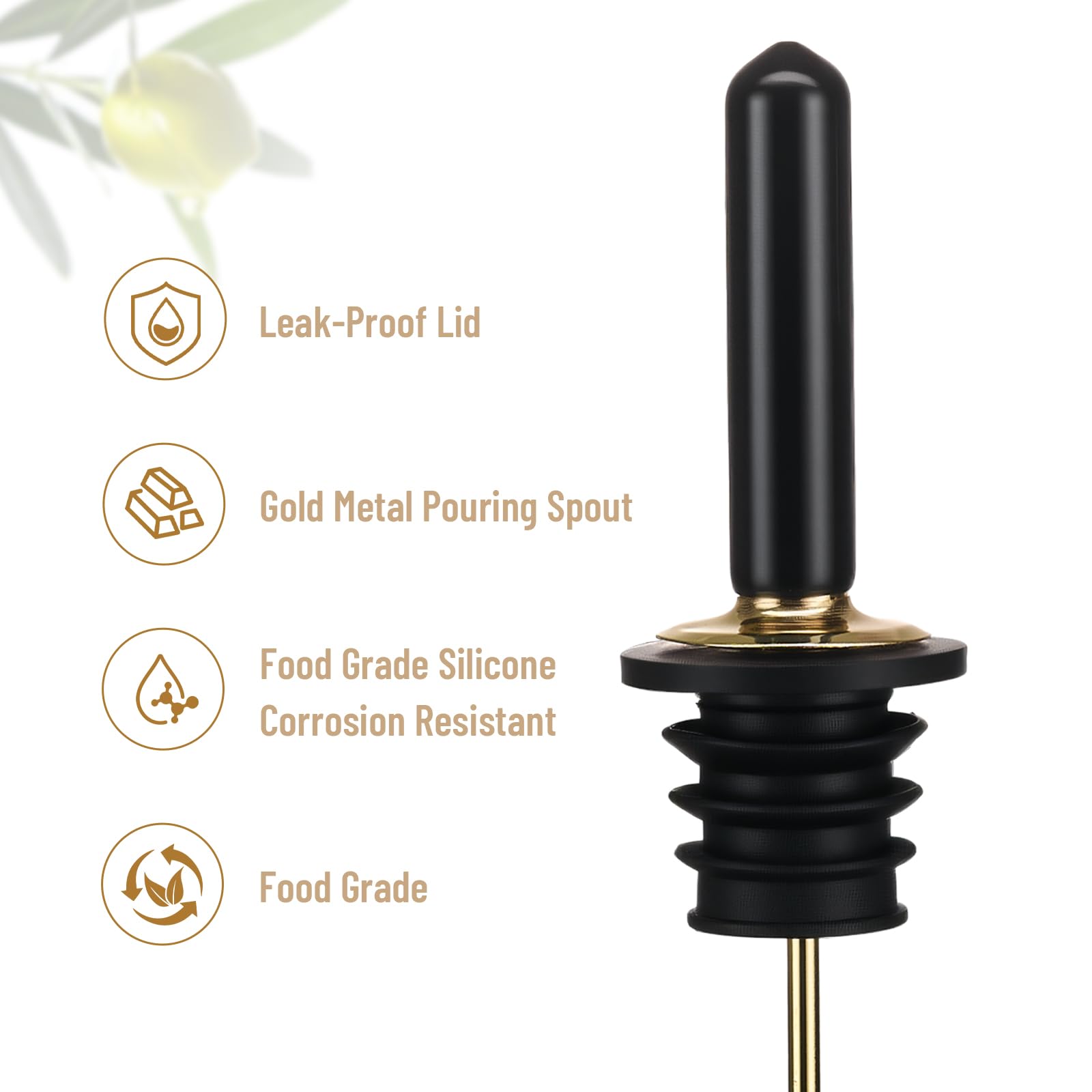 • 【Fresh and Leak-Proof】 This olive oil dispenser bottle comes with an airtight stopper. oil bottles for kitchen It keeps the solution inside fresh and away from dust and air. And the T-shaped stopper has a tight seal to prevent spills when you travel with the oil bottle. Leakproof Oil Dispenser for RV Kitchen The oil dispenser for kitchen also comes with a silicone funnel, which is very convenient for pouring oil, cooking wine, soy sauce, syrup, cocktails, red wine and various condiments etc.