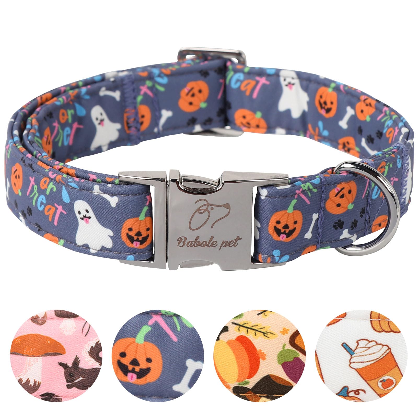 Details: Babole Pet Fall&Winter newest dog collars showcase three holiday themes - Thanksgiving, Halloween, and Christmas. This distinctive collection of patterns draws inspiration from the upcoming holidays and serves as an ideal gift for our beloved furry companions. Crafted from a cotton-polyester blend with an additional layer of polyester material on the surface to enhance color, clarity, and shape, these collars ensure that your dog will stand out and receive admiration during festive occasions. Each collar is meticulously designed to offer a unique style and durability suitable for everyday walks or special events. The designs feature pumpkins, ghosts, and Christmas elements to capture the spirit of the holidays and create joyful memories.