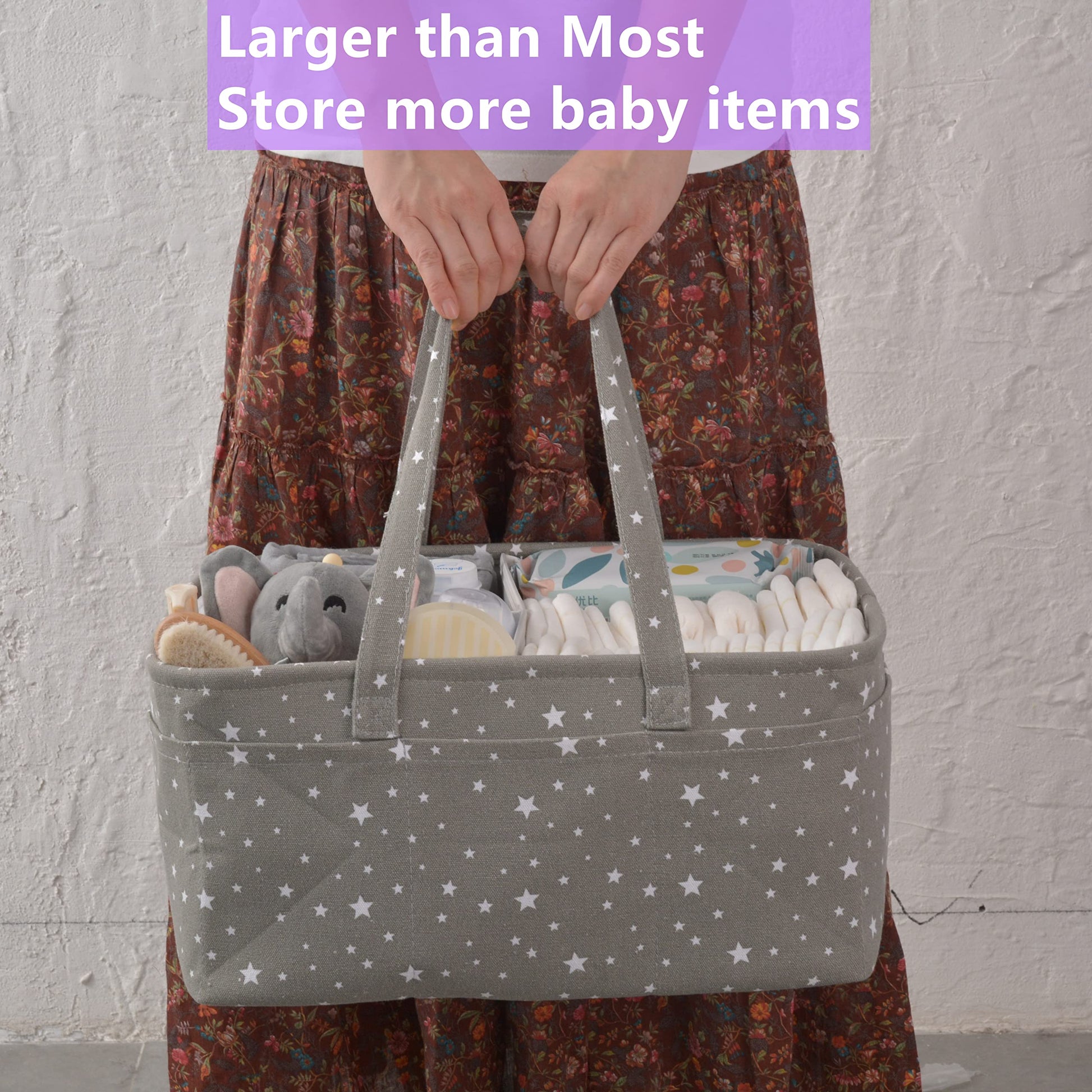 • ⭐ Extra Large Premium Quality Baby Caddy Organizer With Handle: Our foldable diaper storage caddy is 17.5”X12.5”X8”, Larger than most of other diaper storage basket, Its big enough to store all your baby essentials items, Our baby tote organizer is made of Premium cotton canvas, its designed with adorable style and grey dot pattern with one removable divider that you can organize diapering essentials such as, diapers, wipes, lotions, toys and more, all diapering essentials in one place.