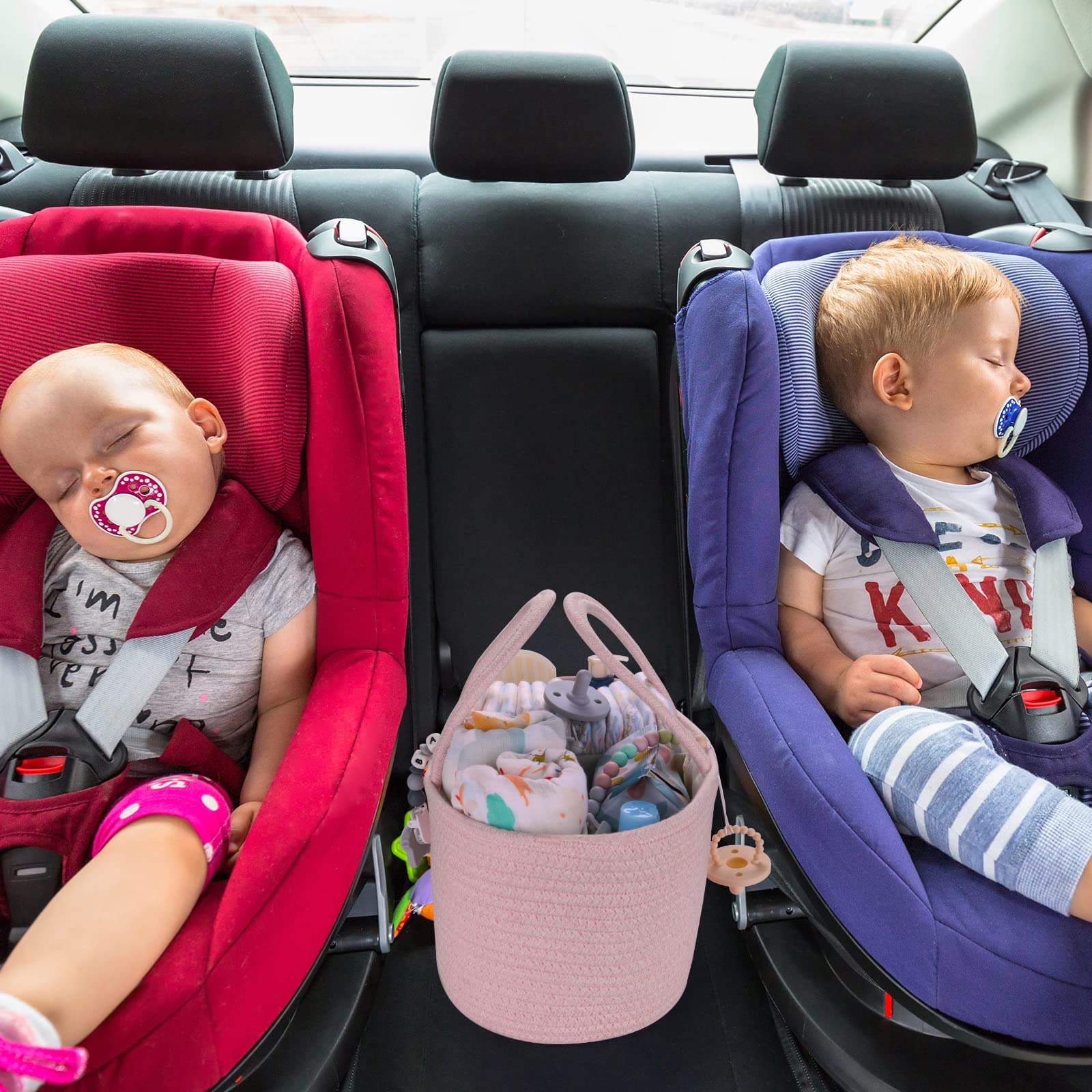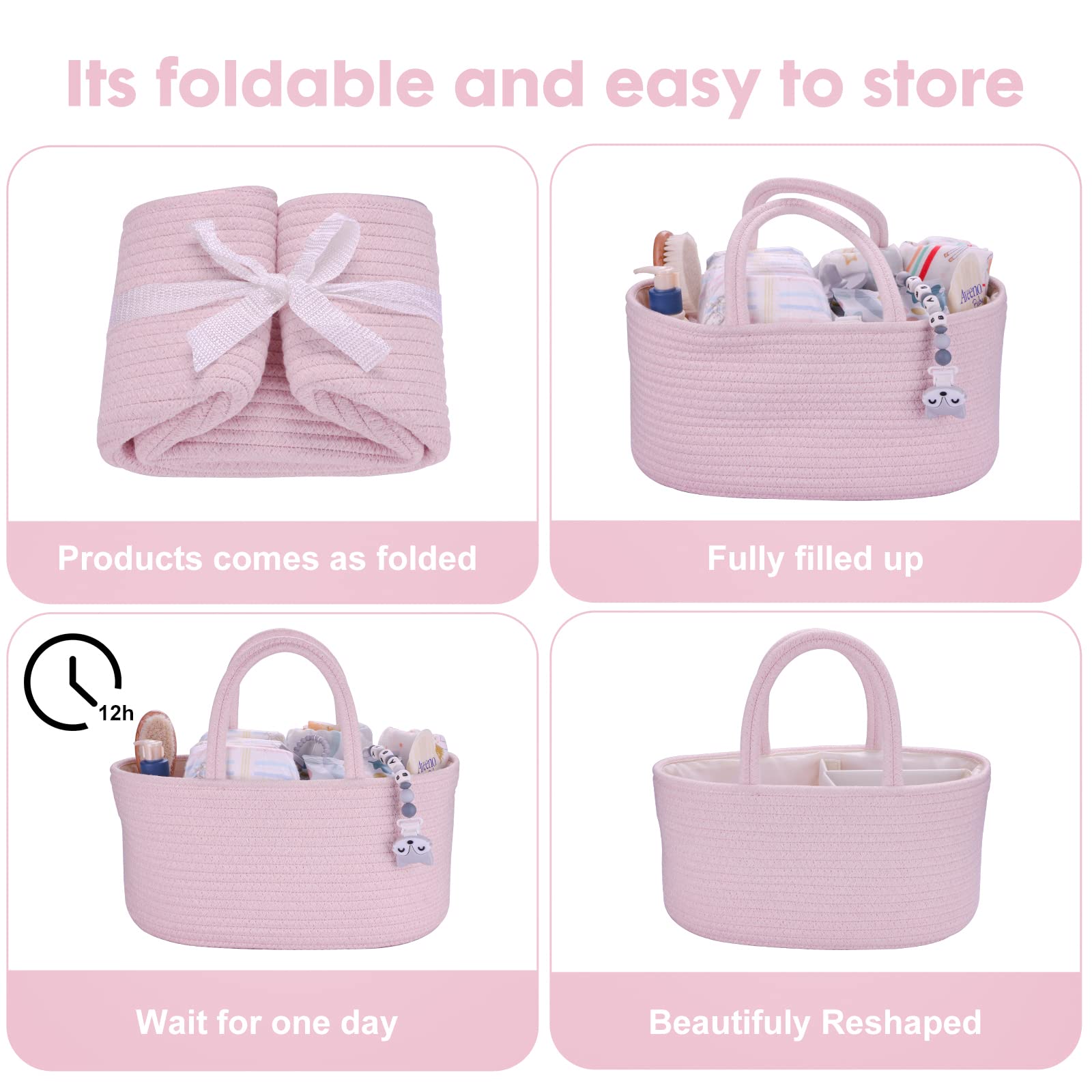 Baby Diaper Caddy Organizer for Girl Boy Rope Nursery Storage Bin Basket Portable Holder Tote Bag for Changing Table Car Travel Baby Shower Gifts Newborn Essentials Registry Must Have Items Pink