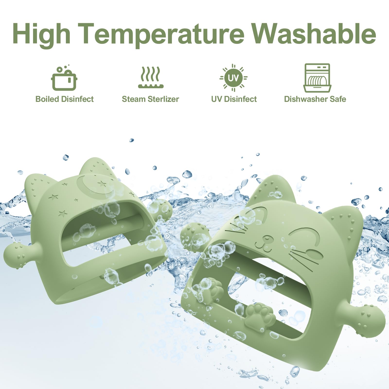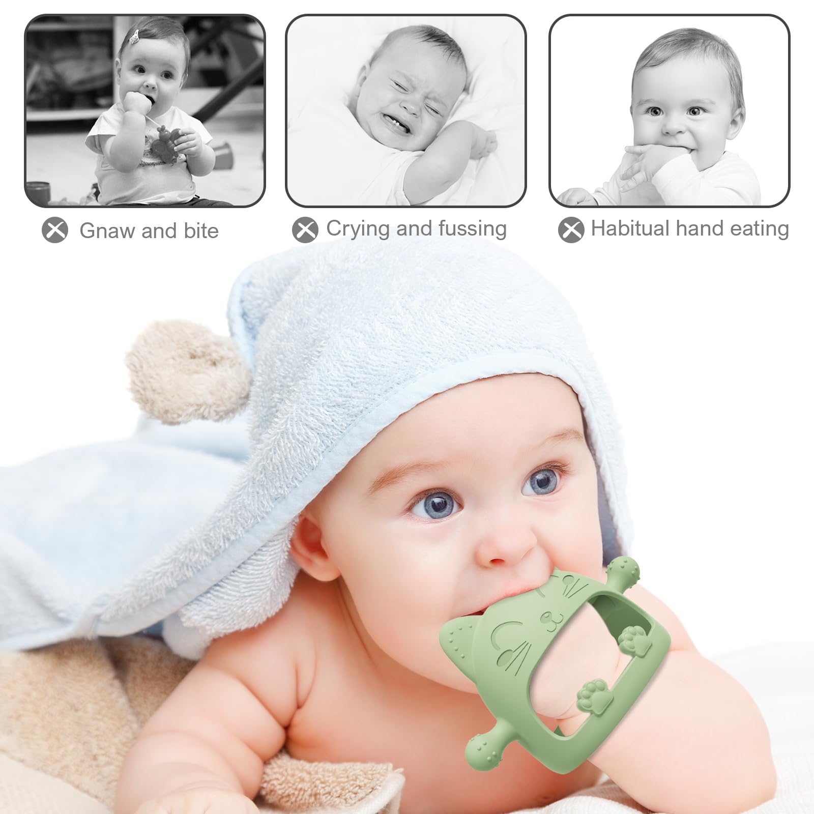 • 【Teething Toys For Babies 0-6 Months】Our cartoon cat baby teether is specially designed for newborns, the teether toys imitates a nipple shape on both sides,which may help babies transition from breastfeeding or bottle feeding to chewing on a teething toy,and soft silicone touch points on the top are designed to accommodate baby's bite in different directions. This design element can provide a familiar feel for babies and make them more comfortable with the teether