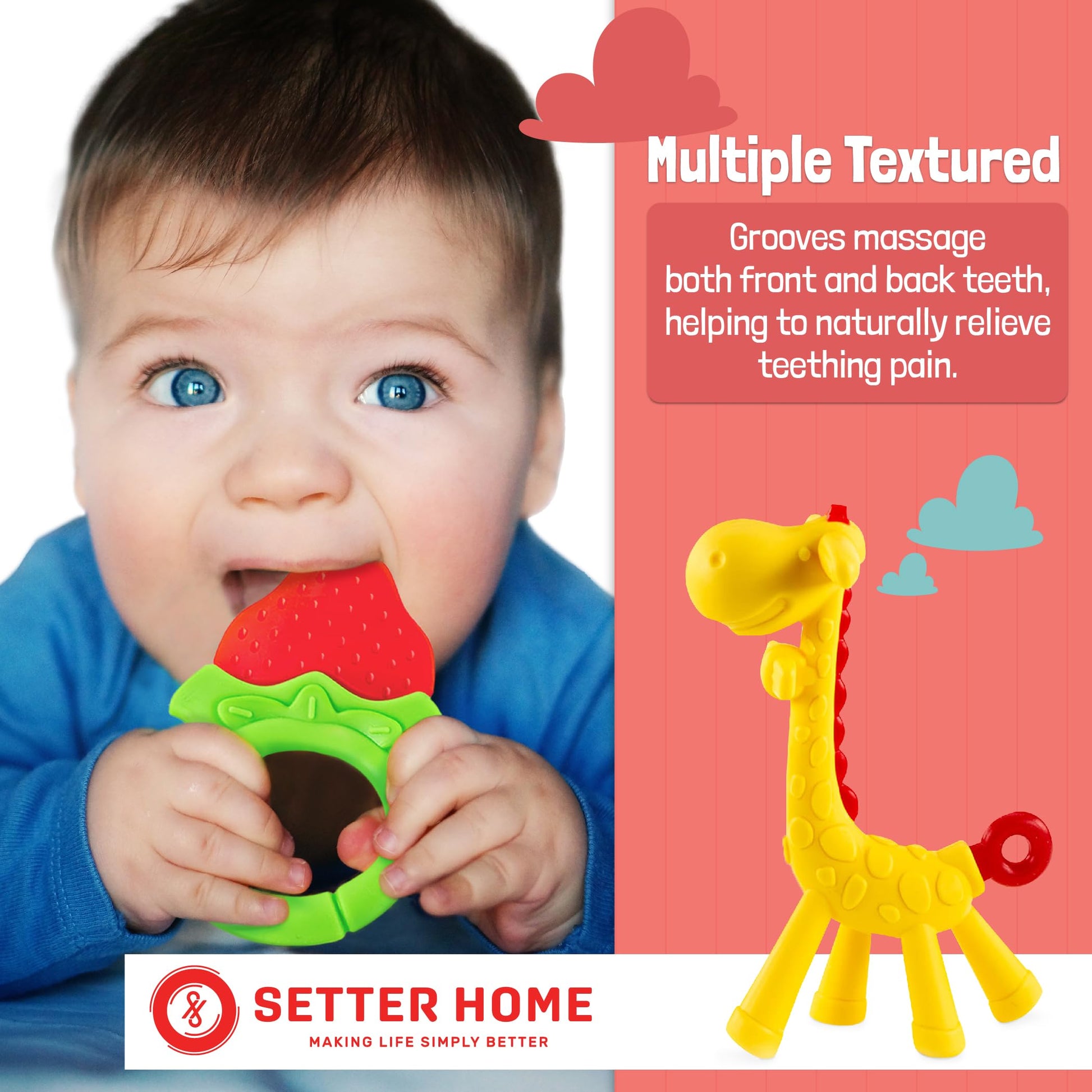 • ๐Ÿ› ๏ธ Easy to Use and Maintain:Compact and lightweight design makes these teething toys perfect for on-the-go soothing, whether at home or away.Dishwasher safe for easy cleaning and sterilization, ensuring hygienic use for your baby's safety and well-being.Designed to withstand rigorous chewing and play, offering long-lasting comfort and relief throughout your baby's teething journey.