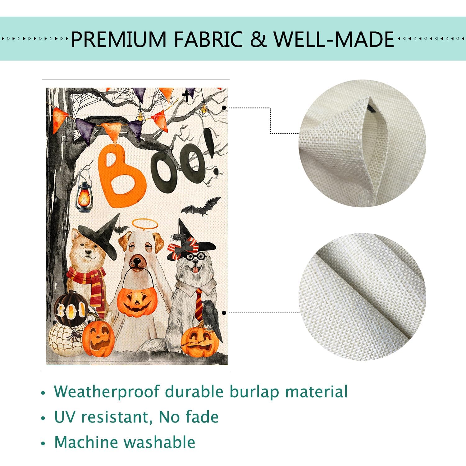 • Premium Fabric And Weather Resistant:Halloween Boo house flags are made of weatherproof and persistent two layers burlap material, can fly in indoor, outdoor. Halloween Boo house flags and banners are washable and are UV resistant, no fade to keep them flying for fall thanksgiving holiday and party