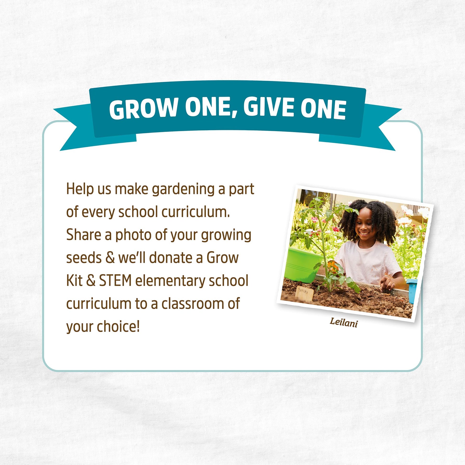• GROW ONE GIVE ONE CAMPAIGN: The perfect holiday gift, it comes in a beautiful packaging so that it's ready to be given to foodie, garden-loving and eco-conscious friends and family; This kit is also part of our Grow One Give One campaign, simply share a picture on social media, tag us and use the campaign hashtag, and we'll donate a kit to a classroom of your choice