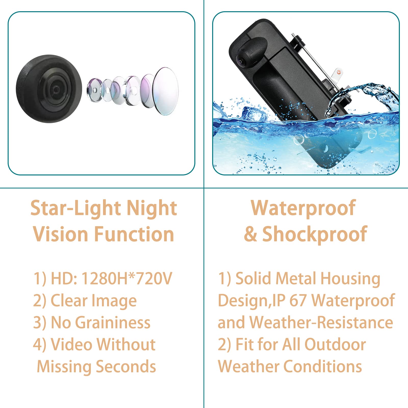 【IP67 Waterproof】The back up camera is made by high-purity resign, with international standard IP67K waterproof. And our tailgate handle is crafted from reinforce ABS plastic and surface-treated to create durable surface for years of handling. So you can use it daringly whatever it’s rainy/snowy/hot.