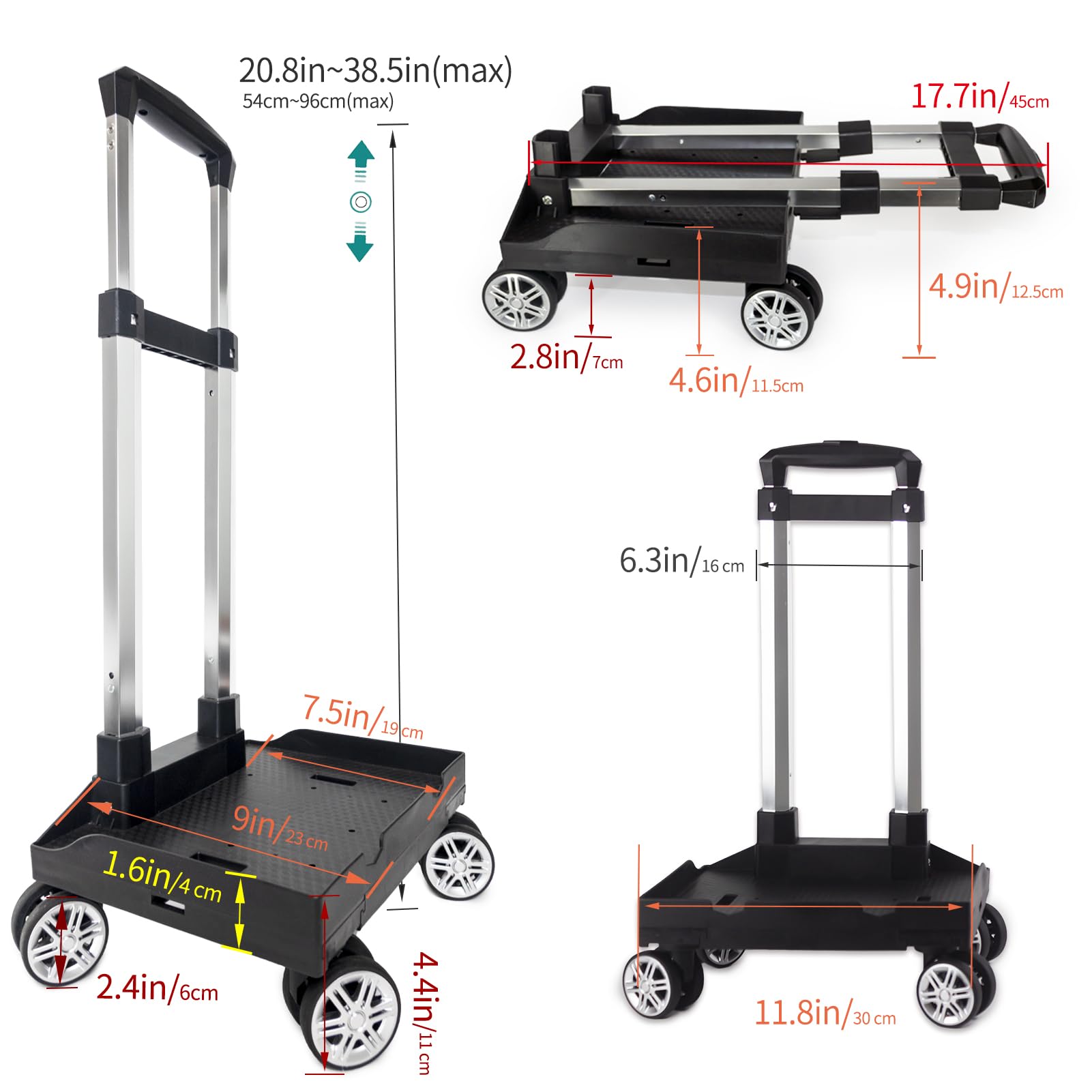 • Adjustable and Reliable: The adjustable handle offers three height options (20.8in/34.6in/38.5in) to accommodate users of different heights. Made from durable PP material, this folding trolley cart can support up to 77lb/35kg.