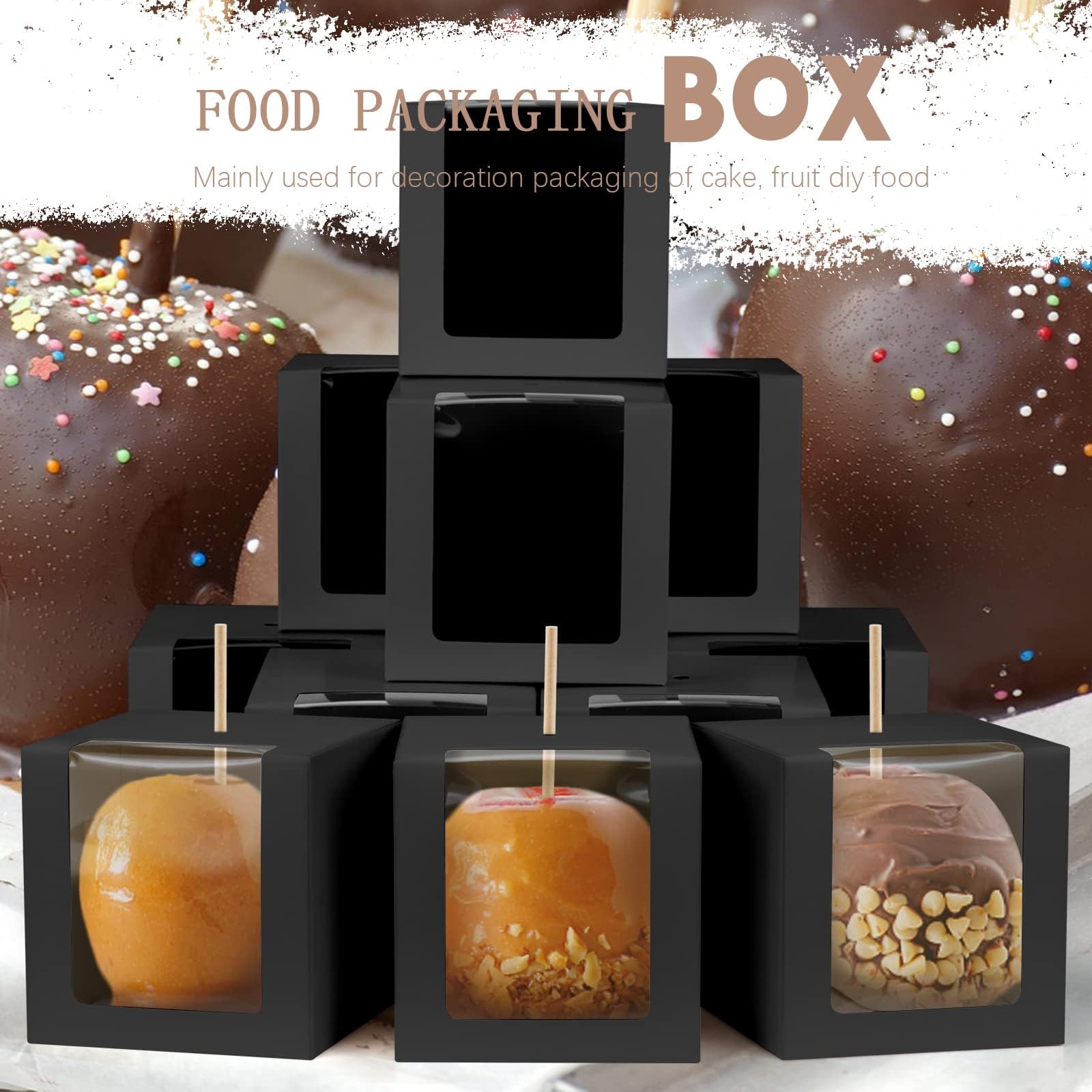 BadenBach 40 Pack Kraft Candy Apple Boxes with Sticks,4" x 4" x 4",Caramel Apple Box Kit Chocolate Cake Treat Boxes with Clear Window for Wedding,Party,Birthday,Baby Shower,Halloween (Black)