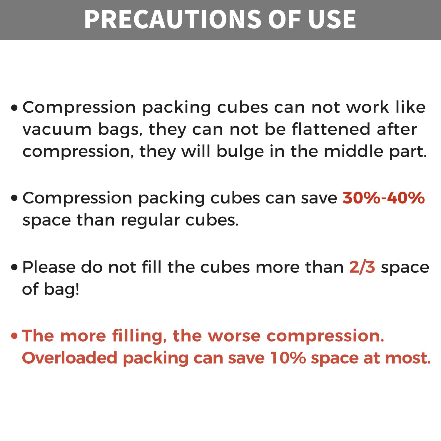 • HOW TO MAKE THE COMPRESSION HAPPEN? - There Is a Extra Zipper Outside Of Our Compression Packing Cubes Which Can Be Zipped Up To Flatten The Cubes And Save The Space As Far As Possible. It Just Works Like a Vacuum Sealer. You Just Need To :1) Fold Your Clothes And Flatten Them 2)Pack Clothes In The Cubes And Zip The Normal Zipper. 3)Put A Finger On The Back Of The Zipper In The Space When Compressing The Packing Cubes In Case The Zipper Get Stuck In Fabric.