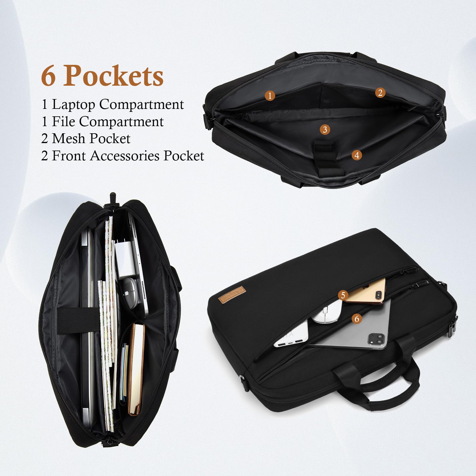 • 【Enough Space】:The laptop compartment provides better protection for your laptop. Two interior mesh pockets and two exterior front pockets provide ample storage space for laptop accessories and other small devices such as iPad, cell phone, adapter, mouse, pen, charger, cable, headphones, etc