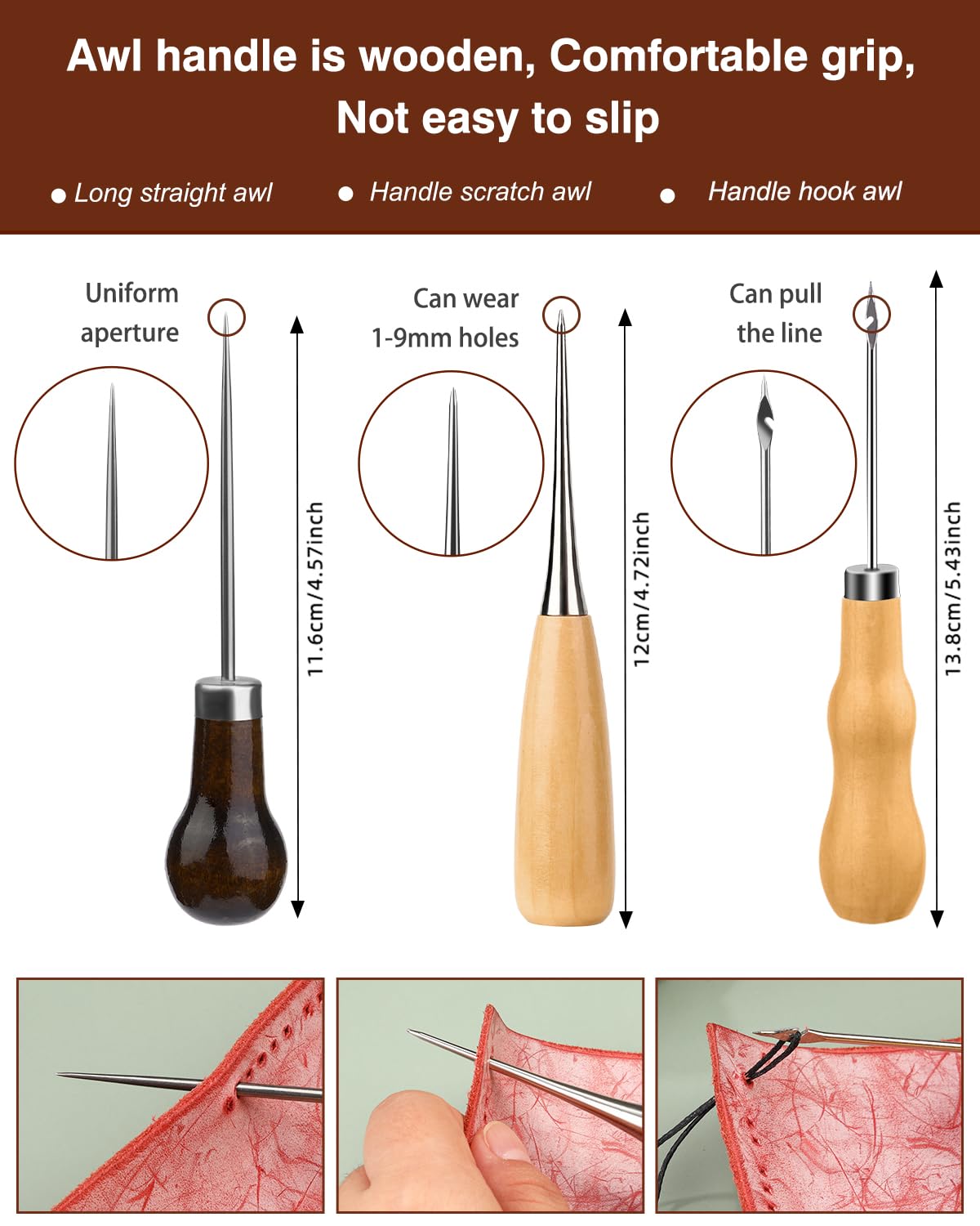 • Sewing Awls: leather stitching kit contains 3 type awls with different functions, long straight awl for punching holes, scratch awl for enlarging the hole, can wear 1-9mm holes, hook awl for hooking the thread and sewing, perfect sewing awl Combination does not require you to purchase separately.