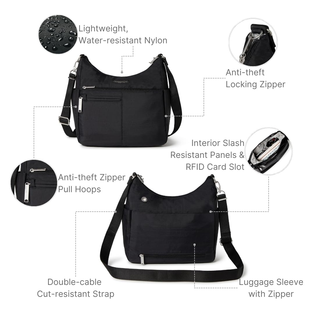 The Baggallini Securtex® Anti-Theft Free Time Crossbody Bag will be your new favorite vacation style. With the option to use as a crossbody or shoulder strapped purse, it has multiple safety features that will make you feel protected in any travel destination. This bag includes slash resistant panels, a double-cable cut-resistant strap, locking zippers and RFID-protection. It’s a spacious water-resistant crossbody bag that weighs 1.125 pounds, and measures 10.5” wide, 9” tall, and 4” deep.