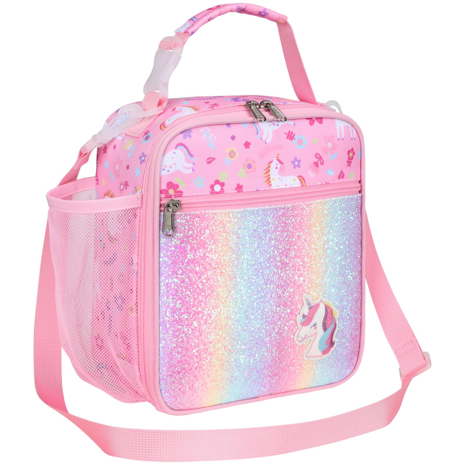 Bagseri Kids Lunch Bag with Shoulder Strap - Insulated Lunch Bag for Girls with Water Bottle Holder Reusable Lunch Tote Bag for School Kids Lunch Box for Girls, Pink Glitter Unicorn