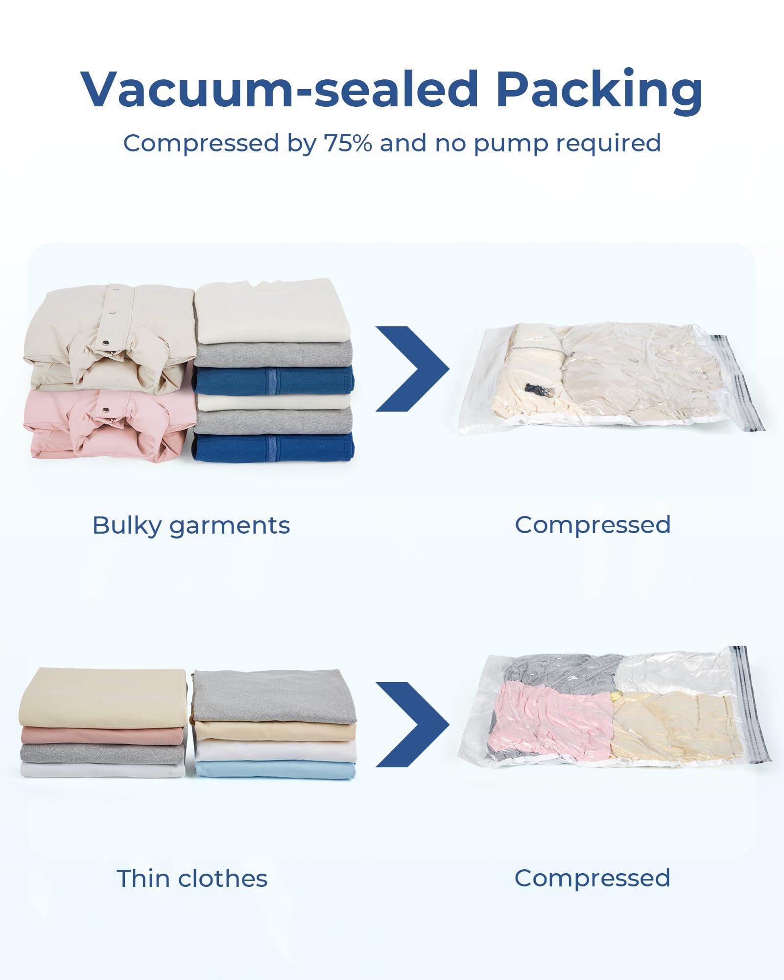 • 4-Pack Hand-rolled Vacuum Bags: The innovative storage solution for travel, no worry about repacking after opening. No vacuum or pump needed. The operation is simple: place your clothes inside, roll the bag from the open end to the sealed end, and the air will be expelled through the check valve, compressing your clothes for storage.