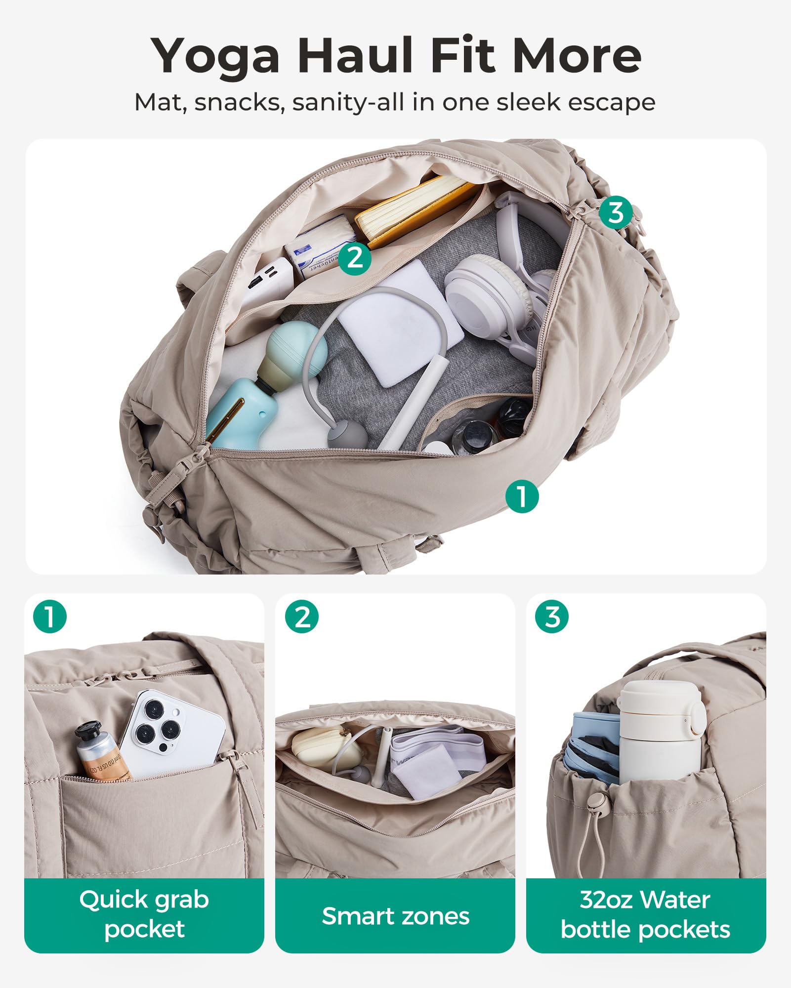 • Yoga-Class Ready: No more awkwardly carrying your yoga mat! The sleek roll-top design features a built-in elastic band to securely hold standard mats (up to 1.5” thick). Arrive at class hands-free and stylish, no separate mat carrier needed
