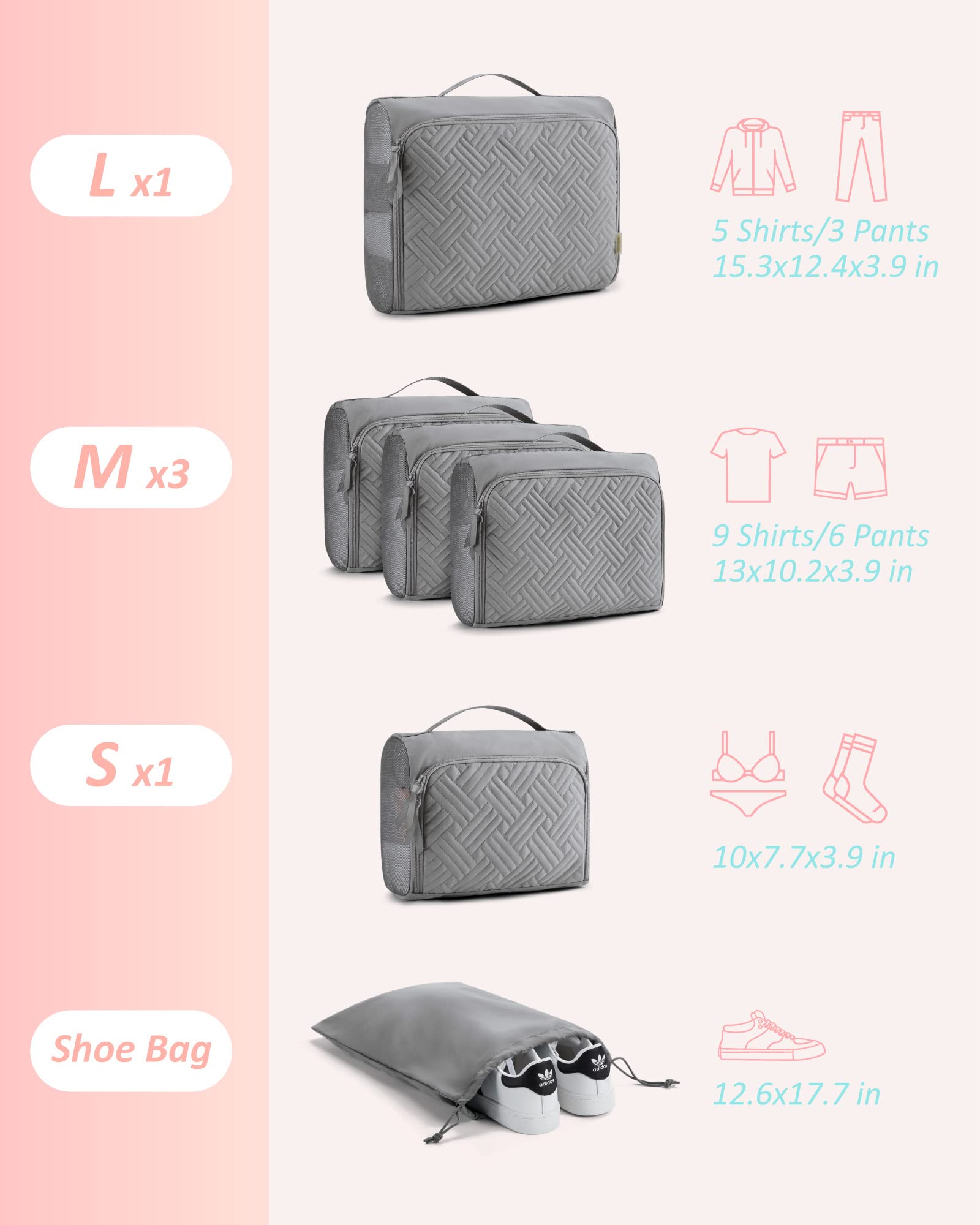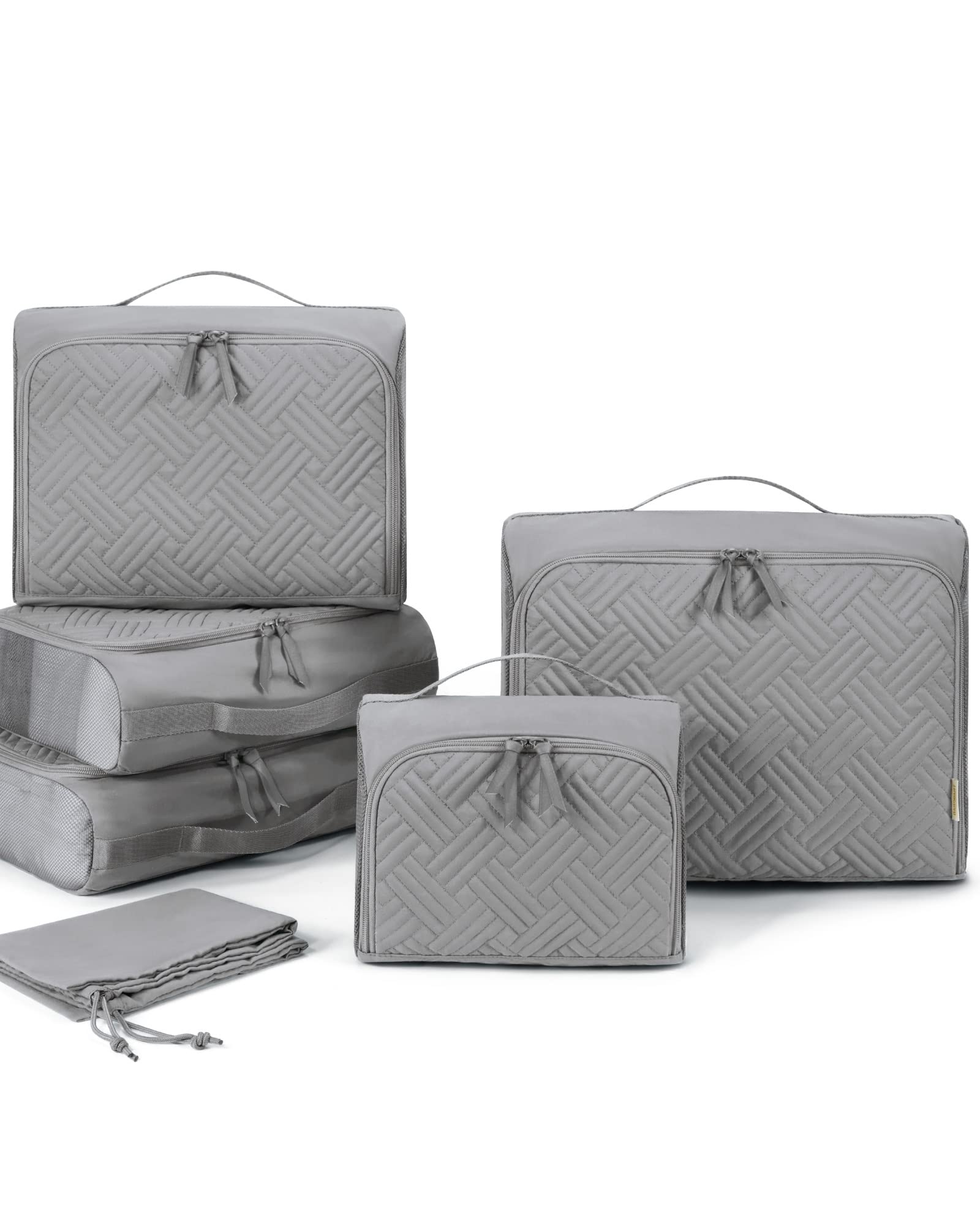 BAGSMART Quilted Packing Cubes for Travel, 6 Set Packing Cubes for Suitcases, Lightweight Travel Cubes (1 L+3 M+1 S+1 Shoe Bag) Suitcases Organizer, Grey