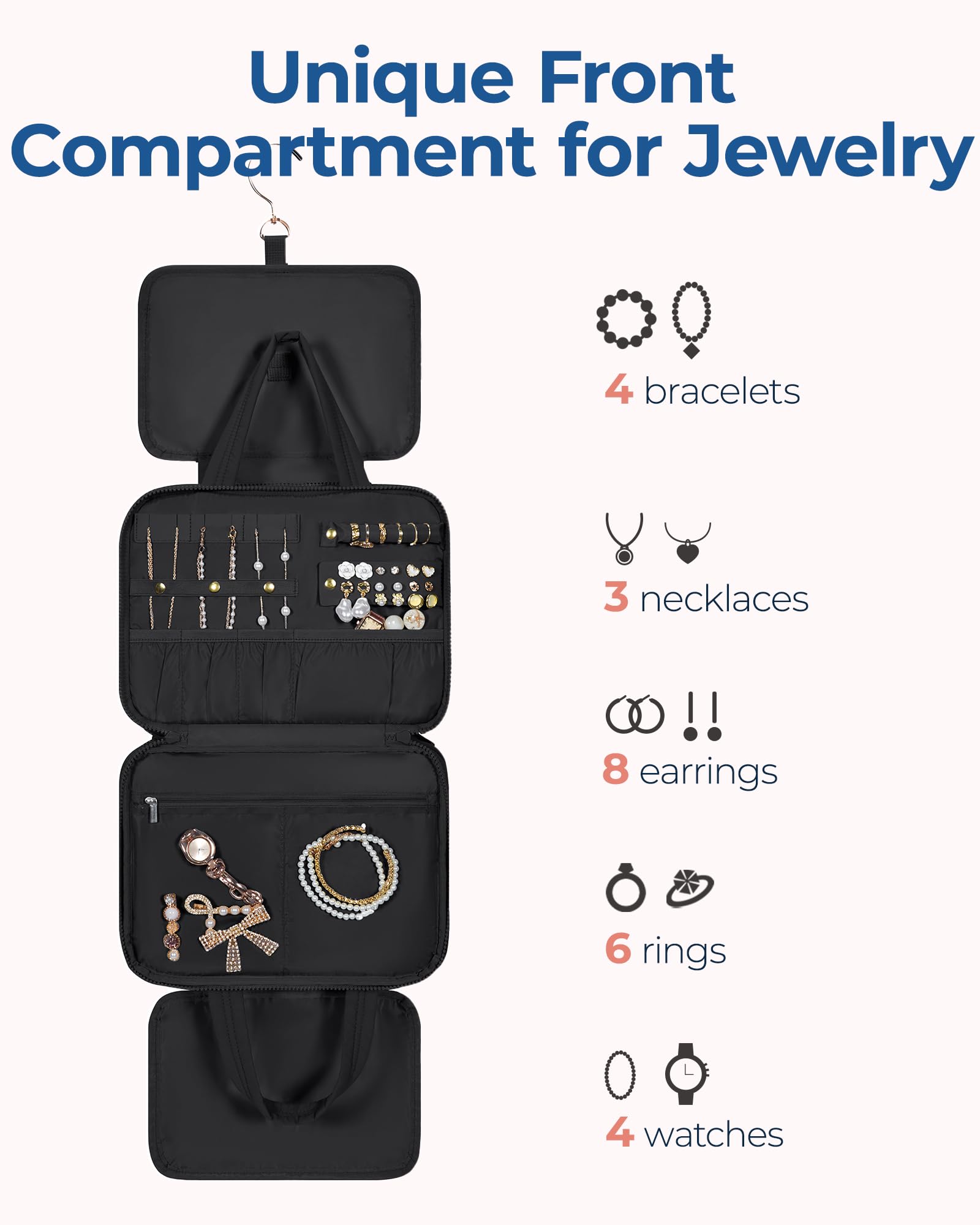 BAGSMART Travel Toiletry Bag with Jewelry Organizer, Hanging Travel Bag for Toiletries, Puffy Makeup Cosmetic Bag Organizer, Carry-on Travel Accessories Essentials, Black-M