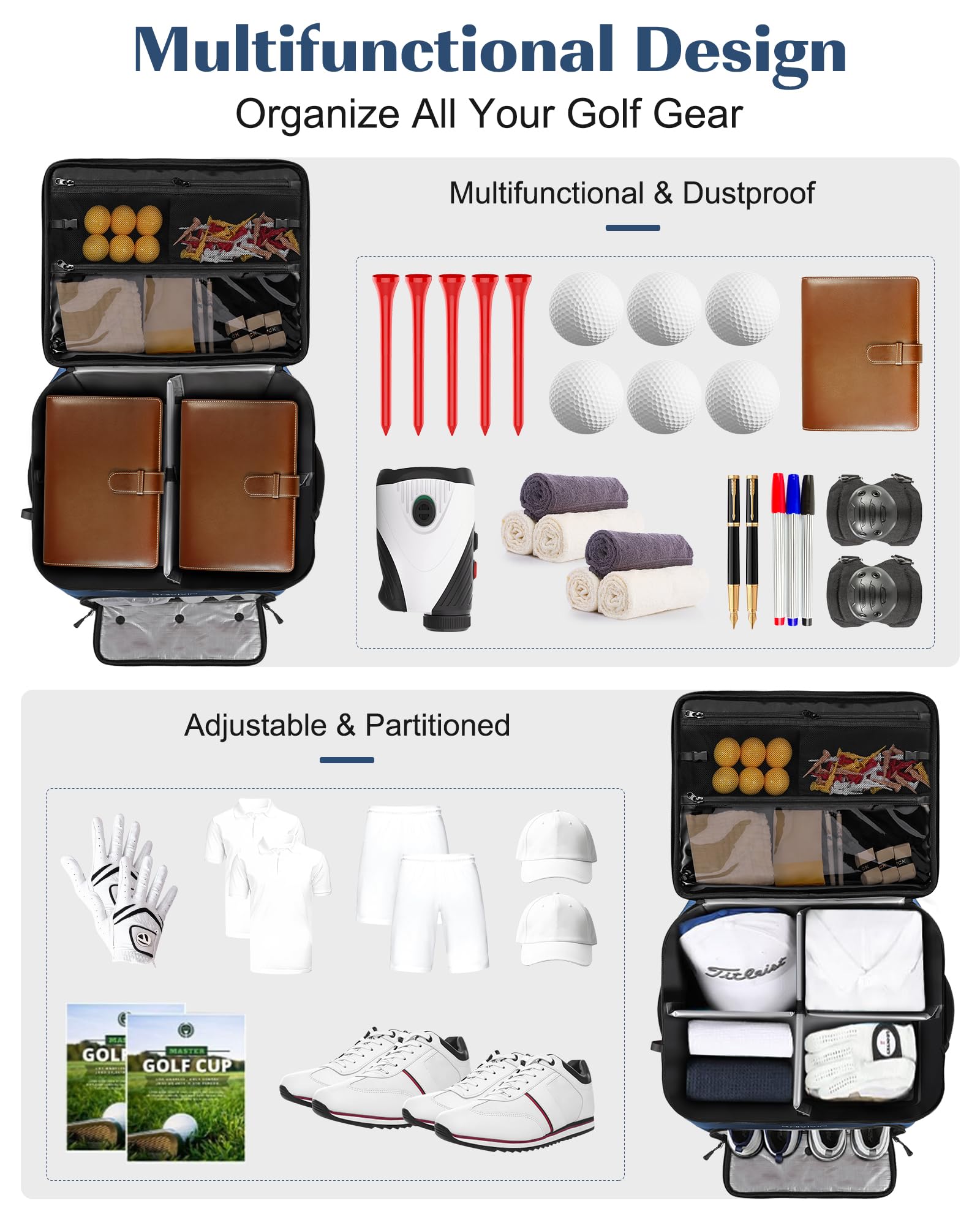 • 【Robust Structure & Lasting Shape】The upper layer is supported by an adjustable woven tape, designed to prevent the top from collapsing. The middle layer features four support plates that ensure the golf storage bag maintains its shape and doesn't collapse due to increased items. The lower shoe compartment is also equipped with three support boards, further enhancing the bag's shape retention. This is a robust, durable, and high-quality storage bag, perfect for those who aspire for excellence.
