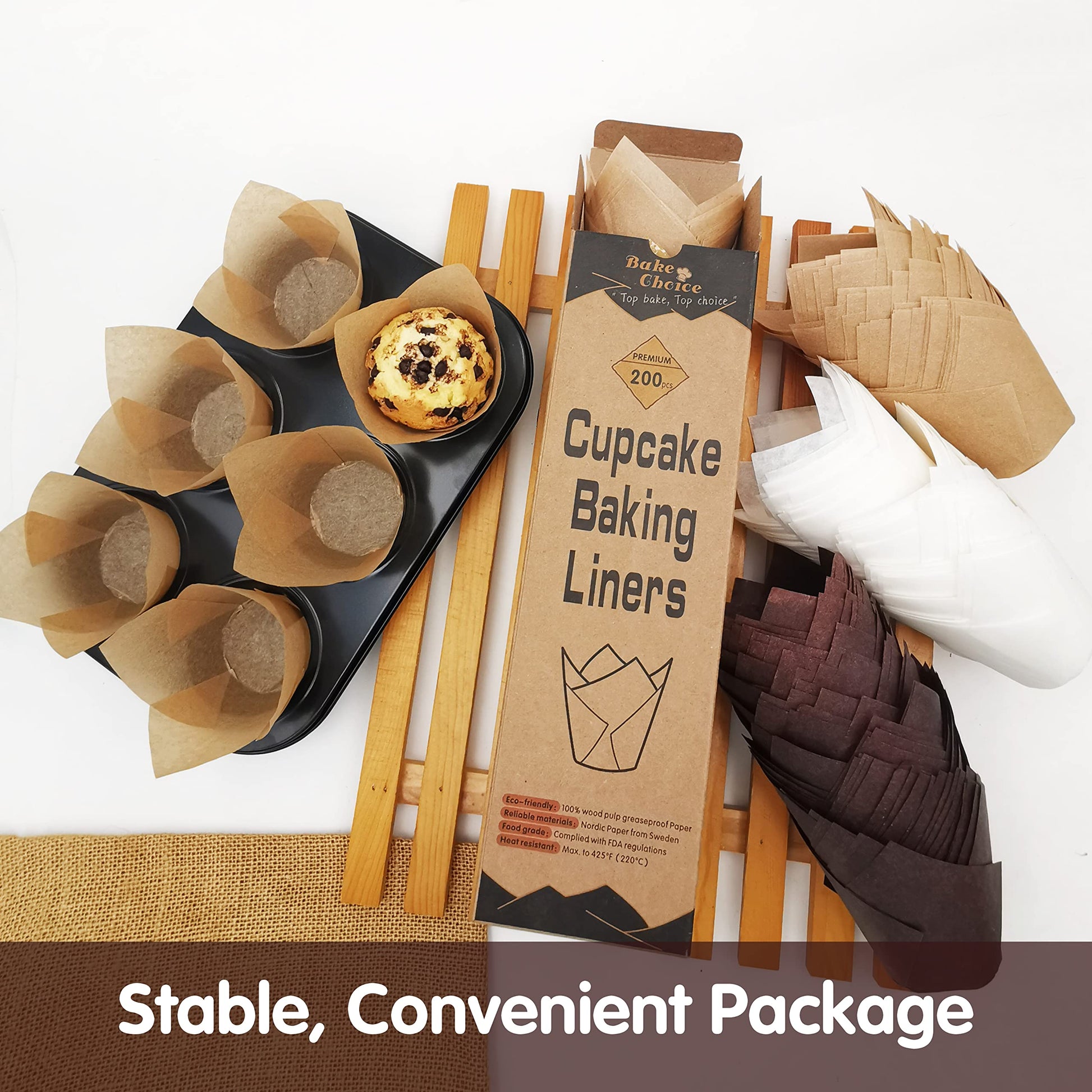 Bake Choice 200pcs Natural Tulip Cupcake Liners for Baking Cups Unbleached European Parchment paper Tulip Muffin Liners, Cupcake Wrapper for Party, Christmas