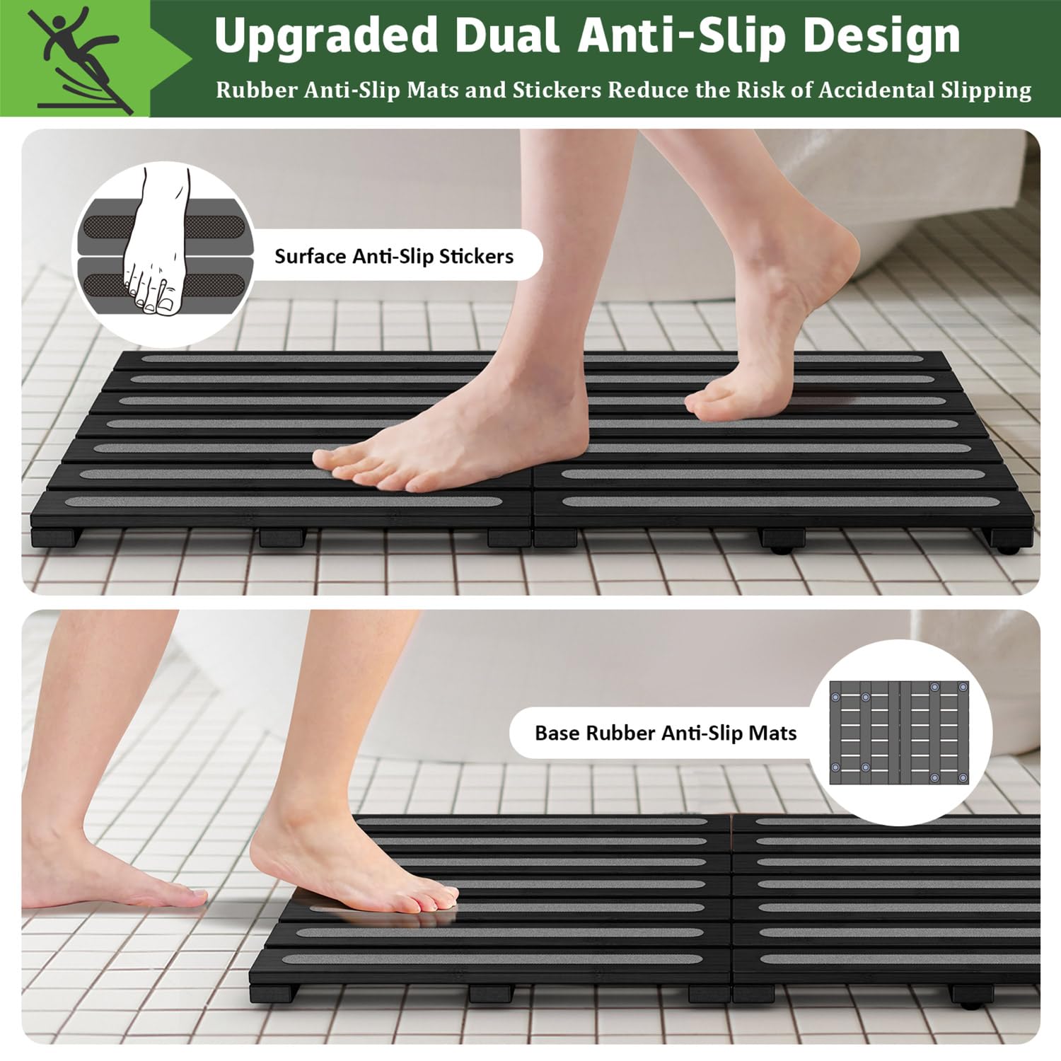 Bamboo Bath Mat for Shower, Dual Anti-Slip for Surface & Bottom, Waterproof Foldable Shower Mat, Easy to Carry and Storage, Perfect for Indoor Outdoor (Black, 26.77×16.14×1.14 Inches)