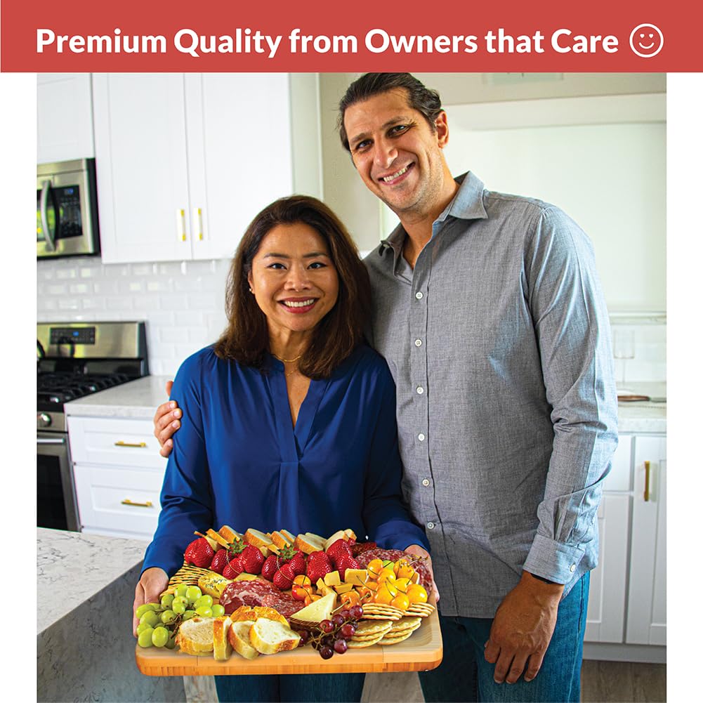 • NO NEED TO BUY ANOTHER CHARCUTERIE BOARD AGAIN - This will last you years and has our lifetime guarantee. Not only is bamboo a great renewable resource for our planet, it's also the perfect material for a cheese plate. Its low maintenace surface is resistant to moisture and won't absorb odors or stain.