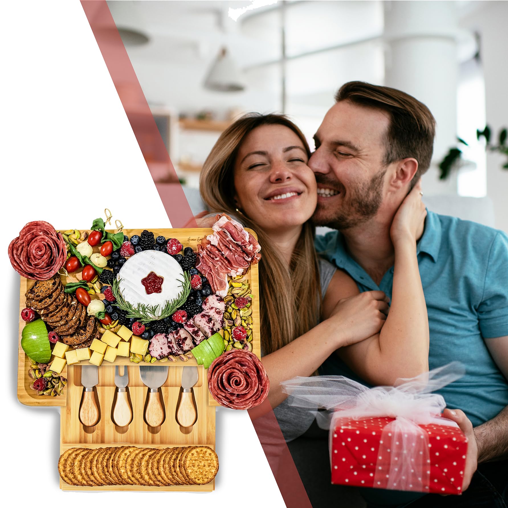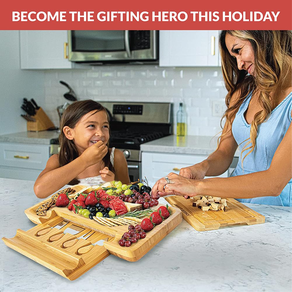 • NEVER LOSE AN ACCESSORY - It's so easy to keep organized with this cheese board and knife set which includes the hidden slide-out drawer with 4 premium cheese knives to its 3 beveled rims. No more running around to find things in your kitchen and no more embarrassing food spills. This rectangular 15.5x11.5x1.5-in charcuterie board set has more space in the center for the main stars: brie, gouda, prosciutto and salami!