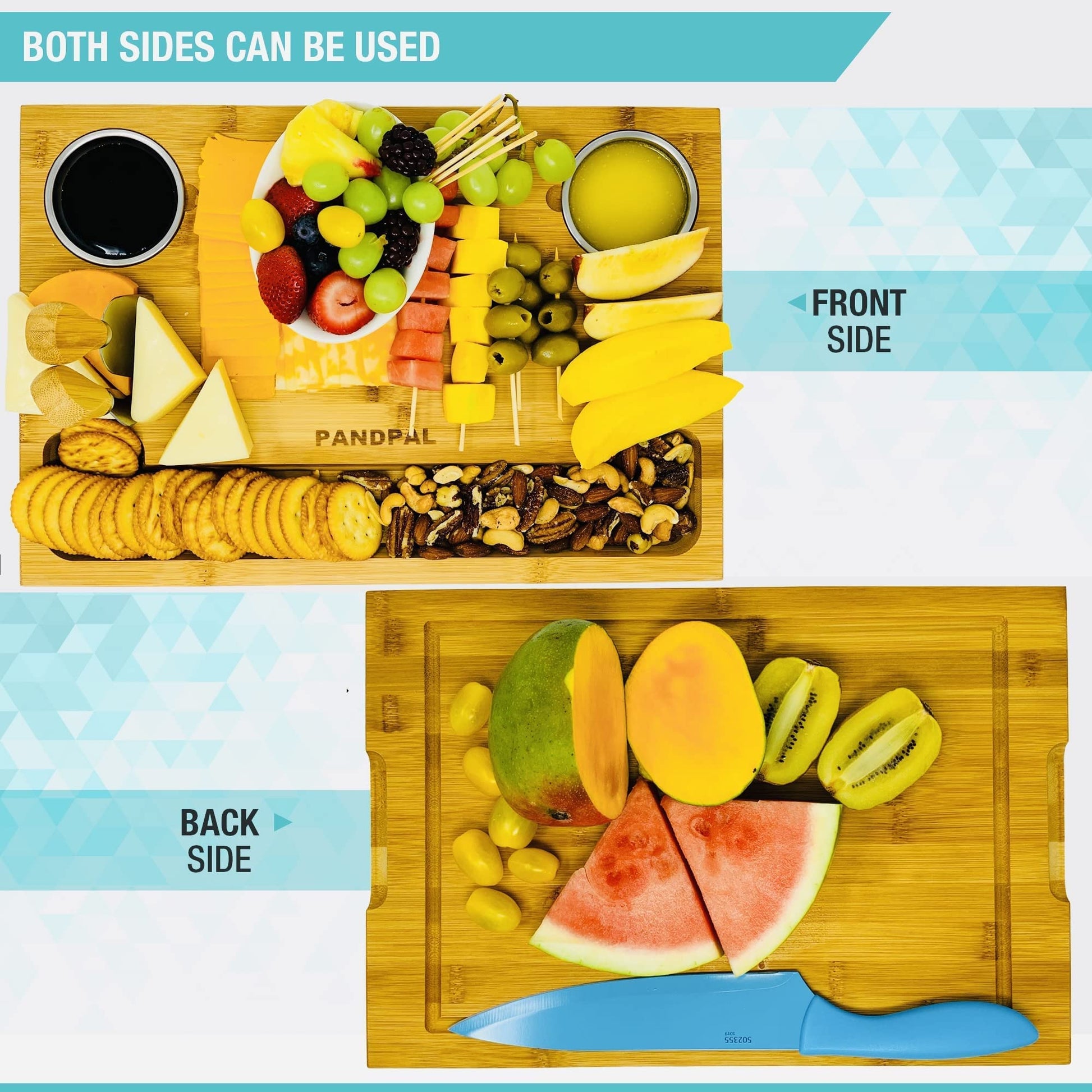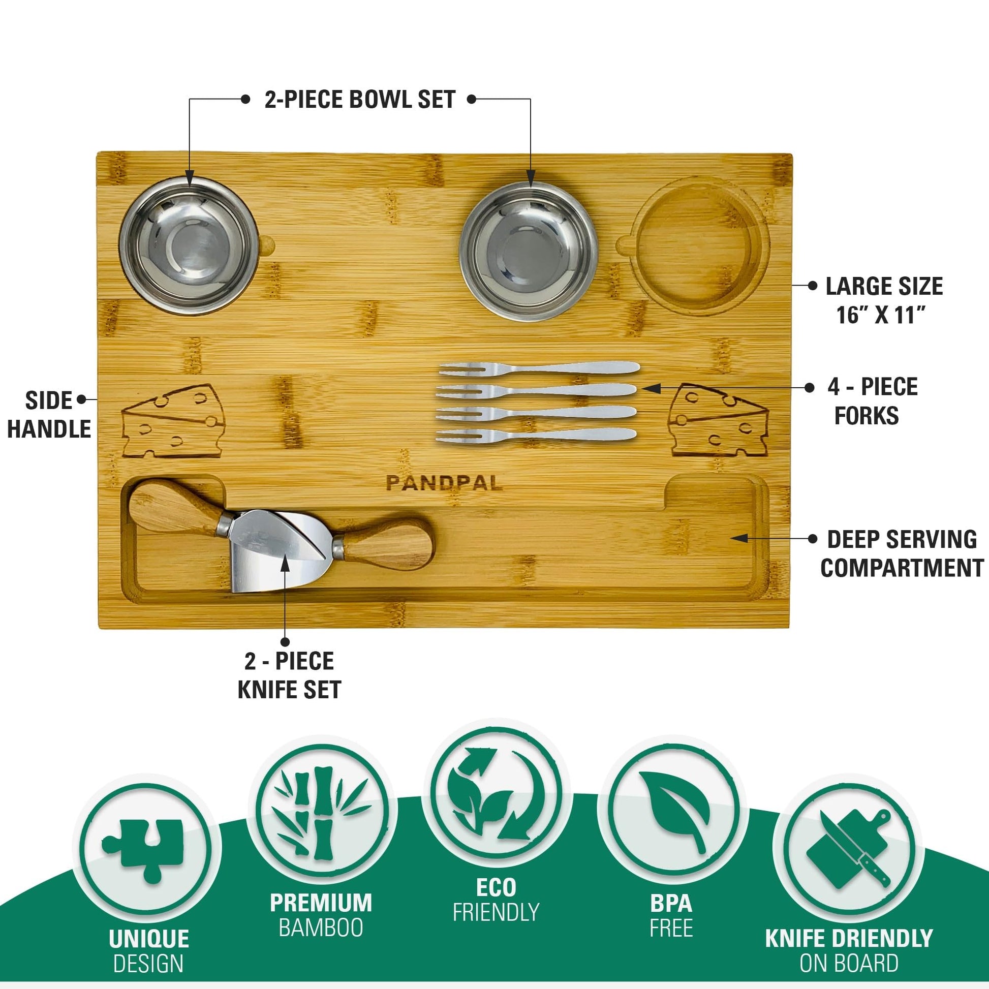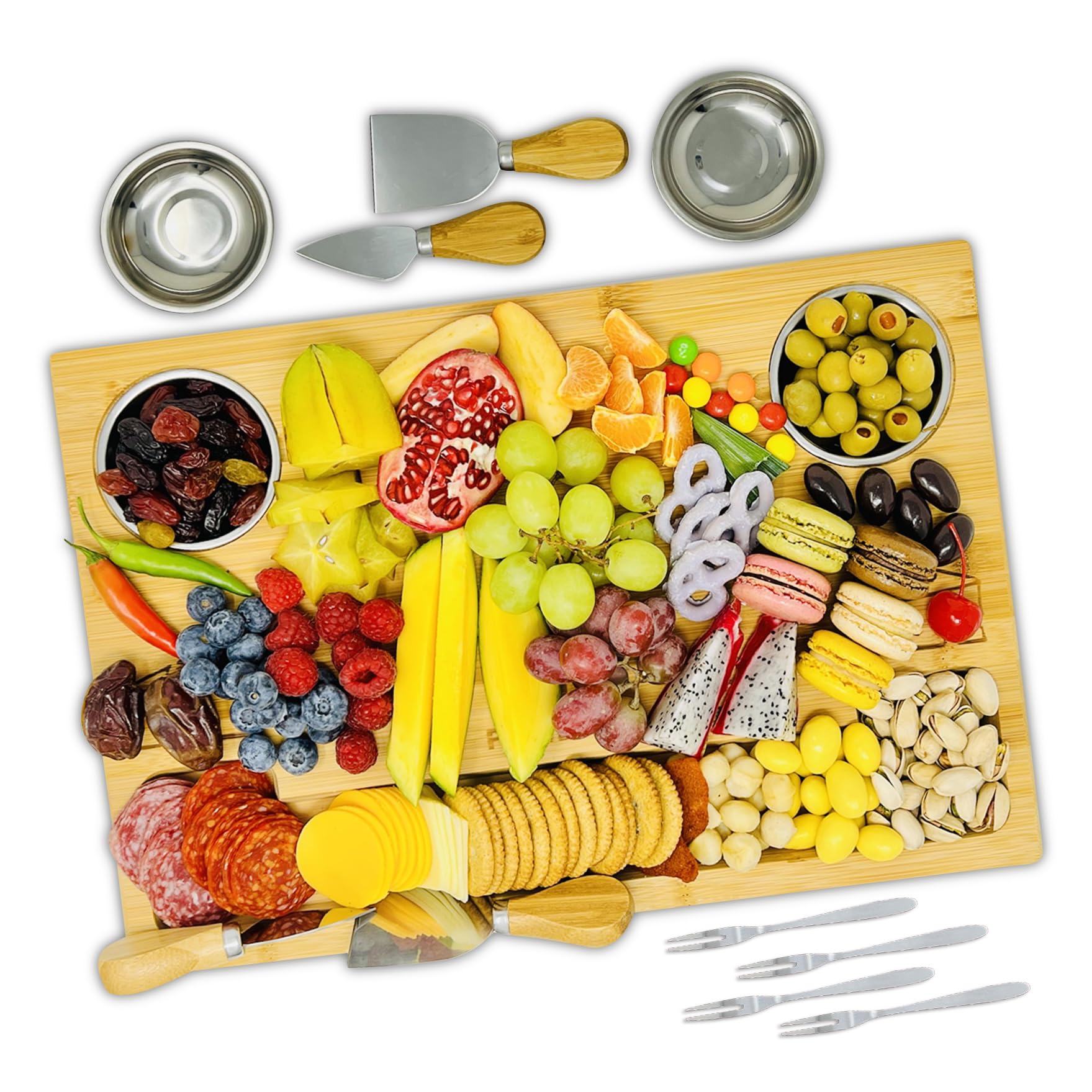 • THE ULTIMATE CHEESE PLATTER SET: This set includes a premium, grooved, double sided bamboo cutting board, forks, bowls, and two stainless steel cheese knives. The wood cutting board is quite large (16”x11”), so it has a large usable surface area. The thick wood board and the two cheese knives are suitable both for restaurants and for home use, and it is also a very practical housewarming gift.