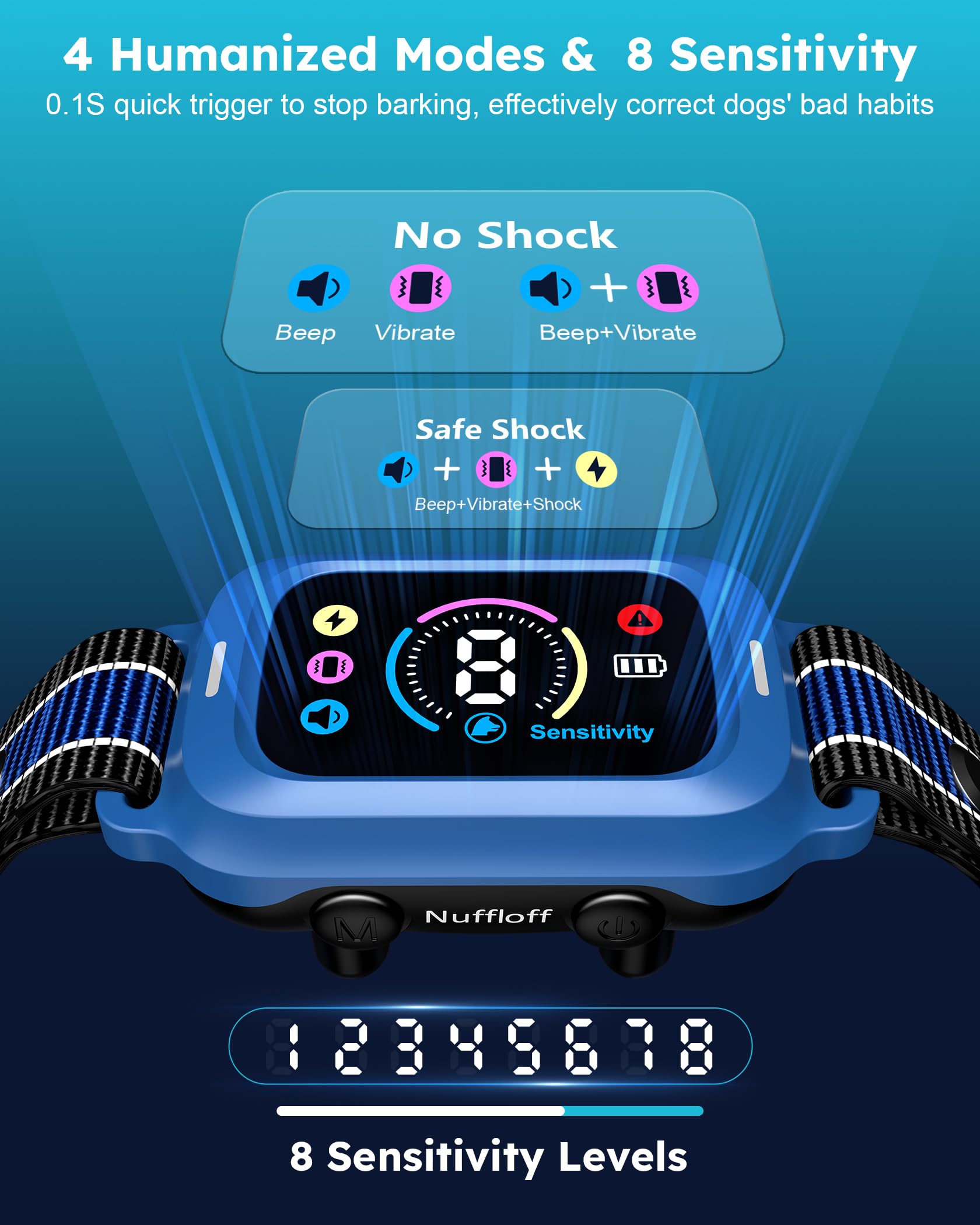 • 【 Longer Battery Life & Quick Charging】 Nuffloff bark collar for large dog can be fully charged quickly in 2 hours for up to 20 days of work time. No need to worry about the problem of being easily exhausted. Nuffloff automatic bark collar uses an intuitive large LED color interface, which is user-friendly to read the selected mode, power capacity, and low battery reminder