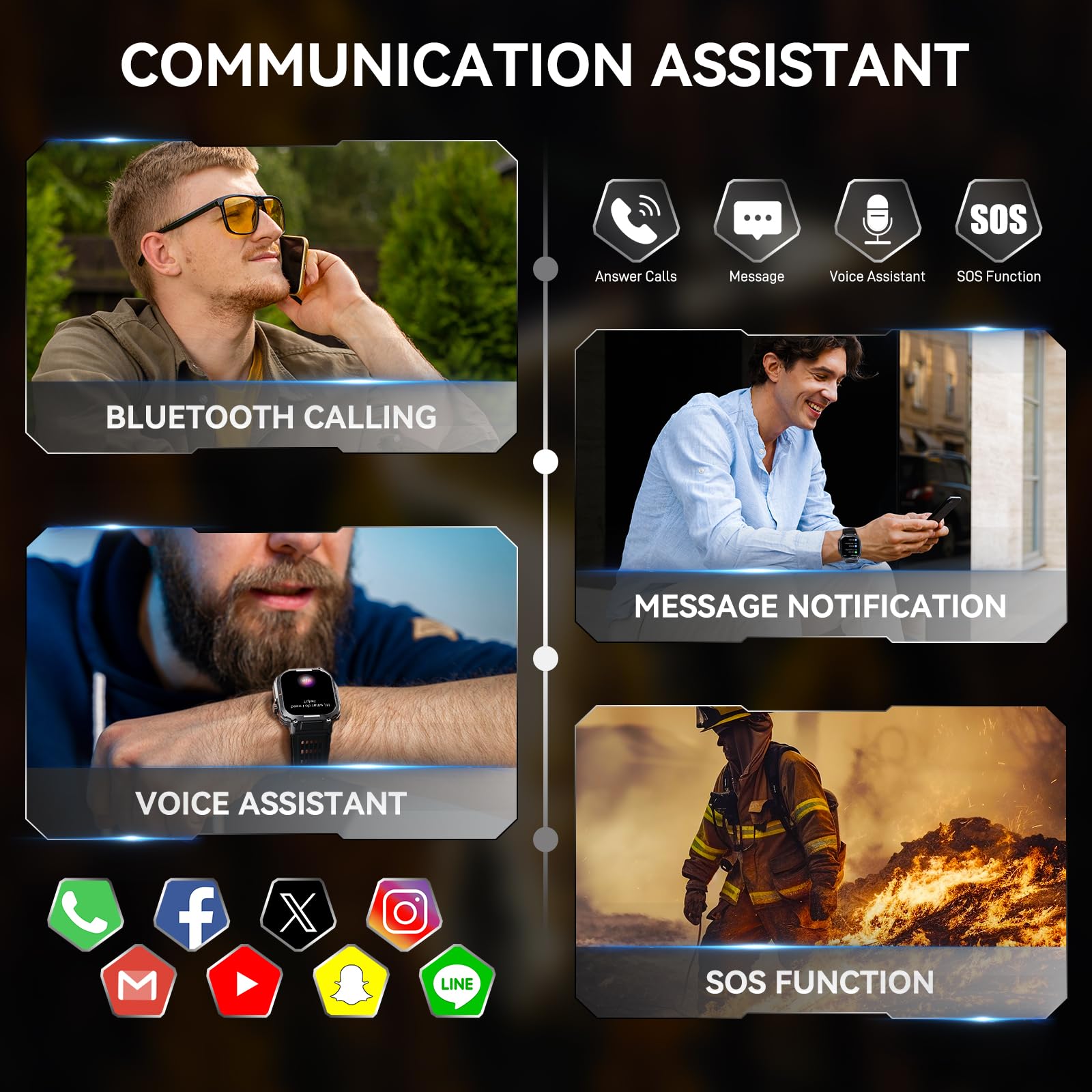 • 【3ATM Waterproof & Military Standard】- The body of the Bassizo military smart watch for men is made of aviation-grade metal, with an integrated design and equipped with a first-class high-hardness, scratch-resistant large glass screen, which is a combination of high-quality aesthetics and excellent durability. At the same time, the rugged smartwatch adopts a fully enclosed 3ATM waterproof design so that you can wear it with confidence for daily water sports such as swimming, diving, and surfing!