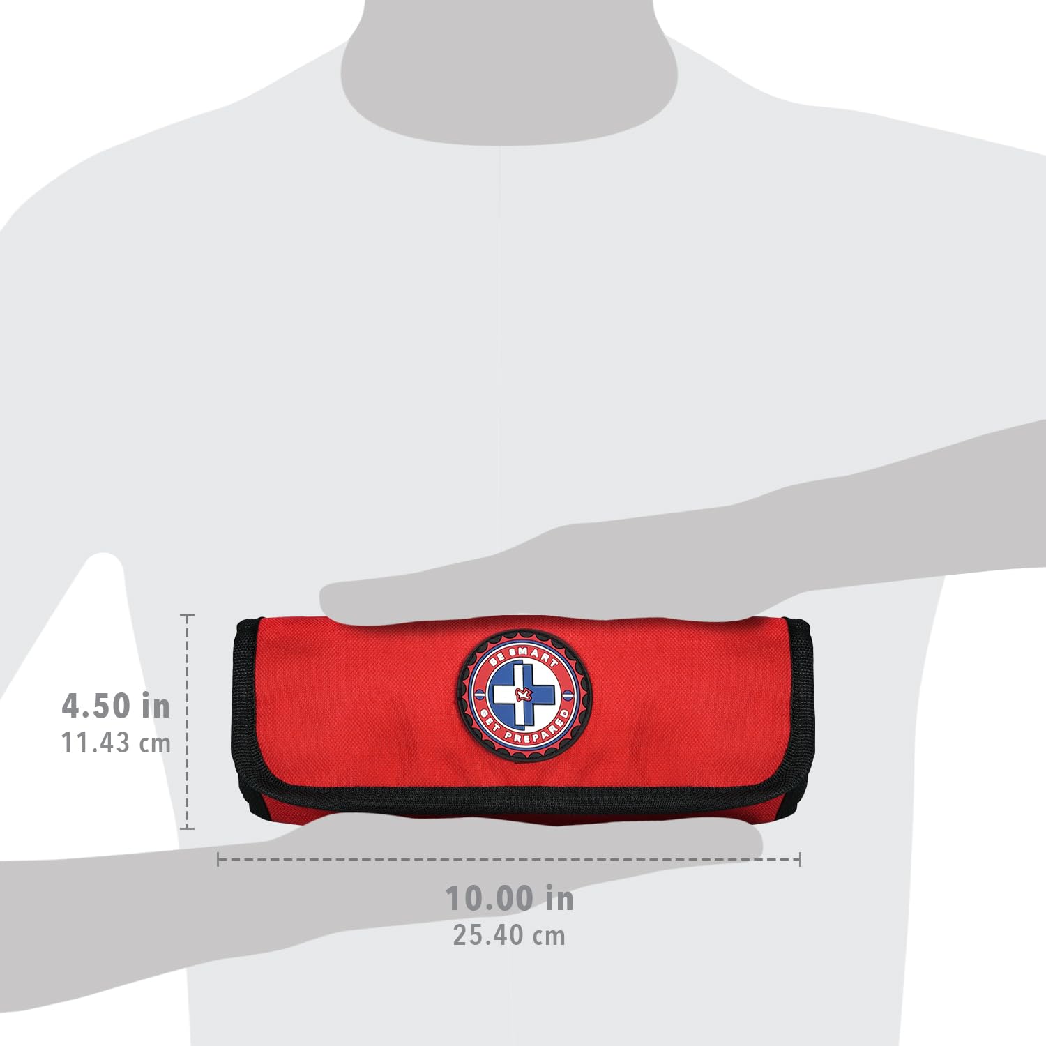 Custom 'roll out' bag can be hung, or rolled out on the ground for easy access to your first aid components. The bag can be rolled up for easy storage (4.5in x 10in x 4.25in), and opened up to 2.75in x10in x16in.