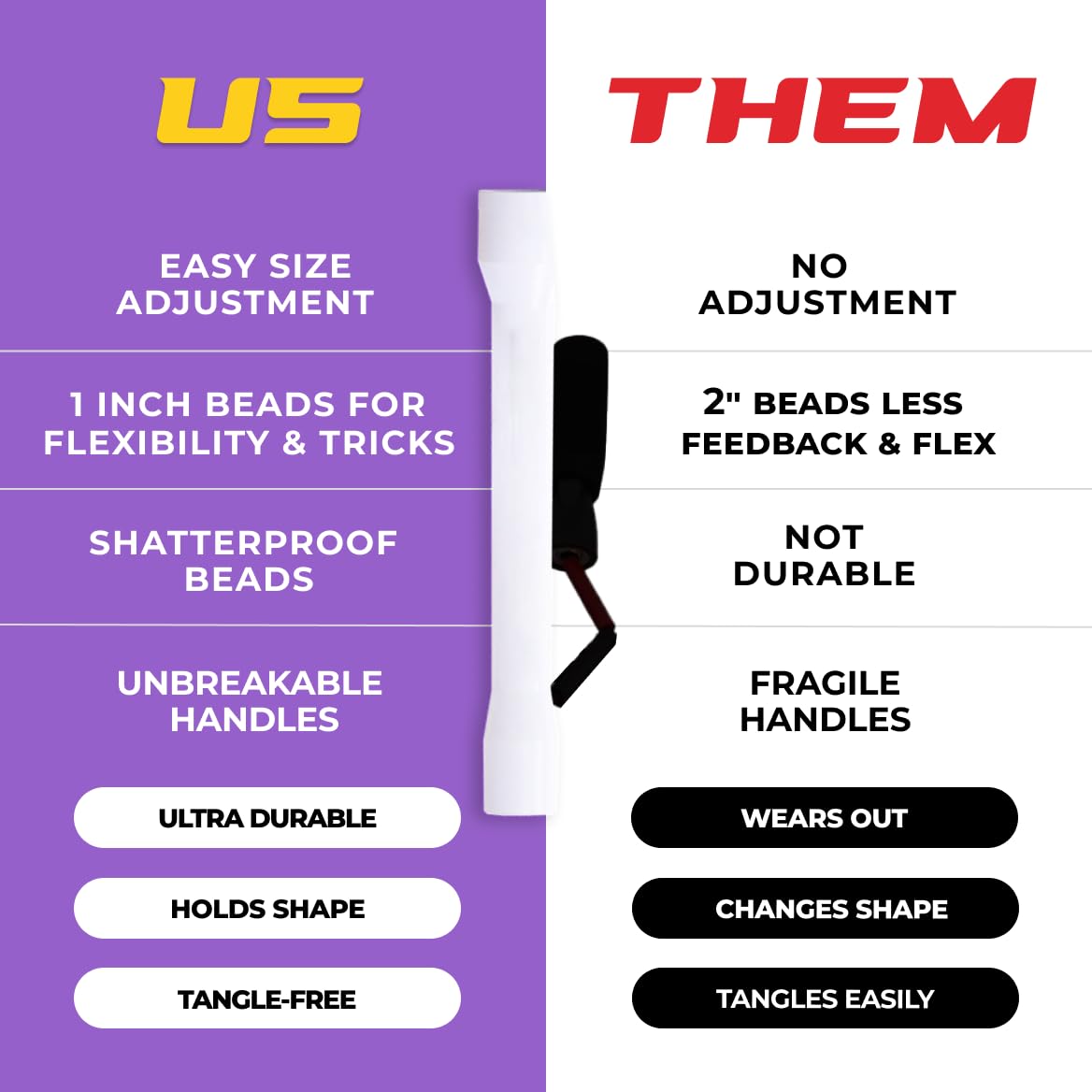 • Durability: Imagine the peace of mind you will have knowing that your kids segmented jump rope is built to last. Featuring shatterproof 1 inch plastic beads over a solid, long-lasting braided nylon cord we have designed this kids jump rope to be tough. We guarantee this plastic jump rope beaded with a one year money back warranty or replacement.