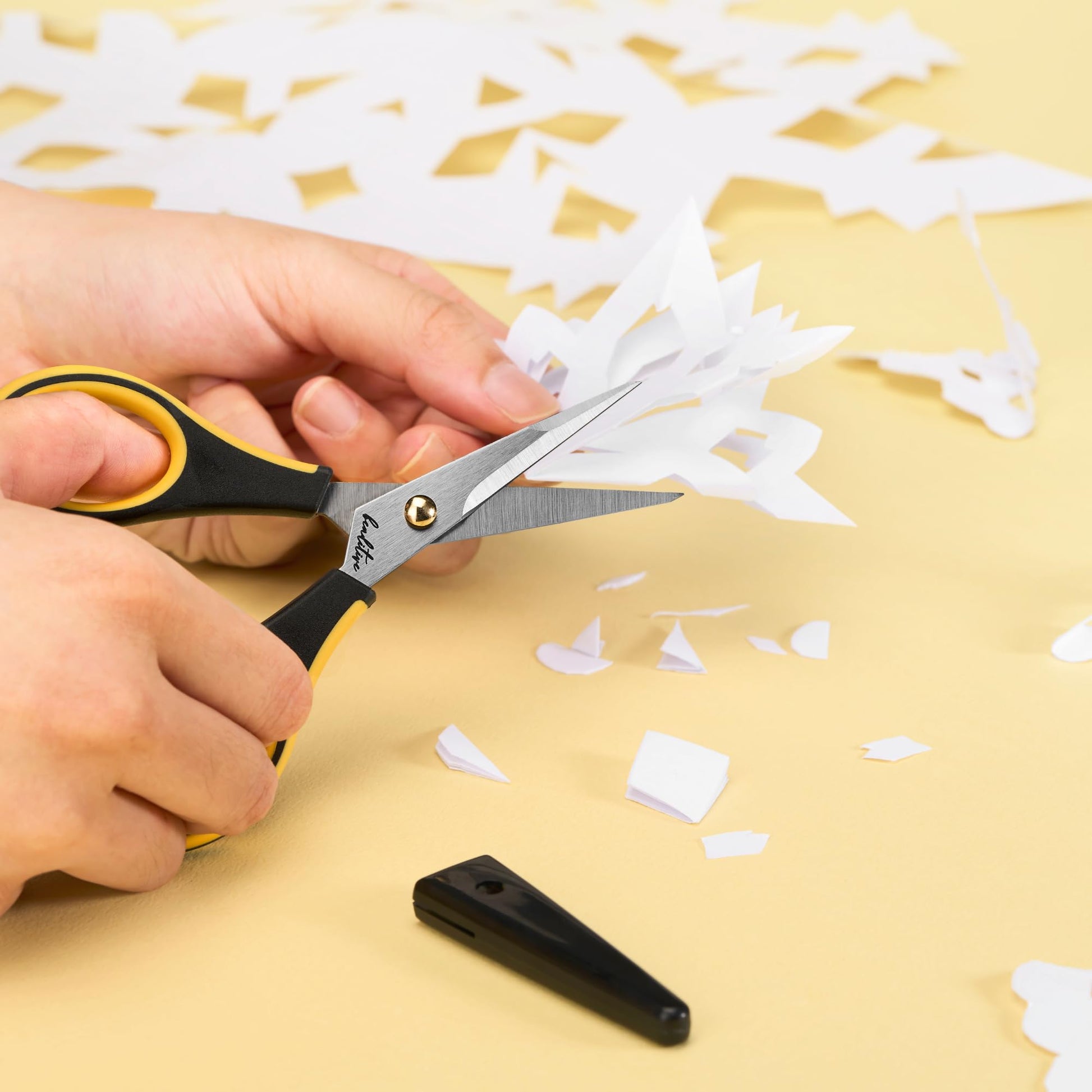 • ✂️ CUT PAPER WITHOUT TIRING YOUR HAND: The ergonomic TPR handles of these professional craft scissors make use more comfortable. They are anti-slip for best control in handling, great for right and left-hand use.