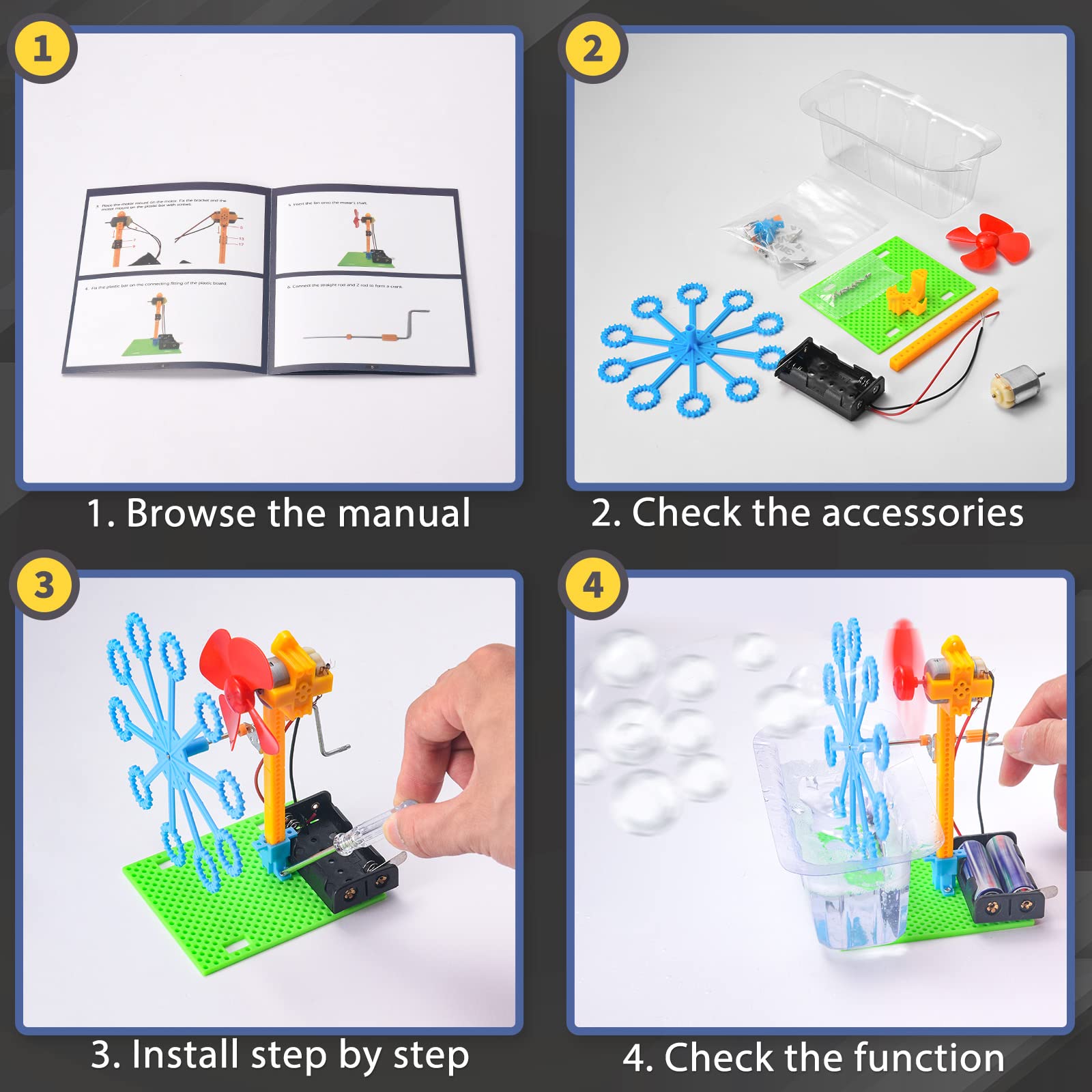 • 6 IN 1 STEM KITS: These science experiments contain a reptile robot, a balance car, a bubble machine, a fiber lamp and a buzzer wire game kit. Kids will be proud of building their own robot. REQUIRES (NOT INCLUDED): BUBBLE SOLUTION, AA BATTERIES