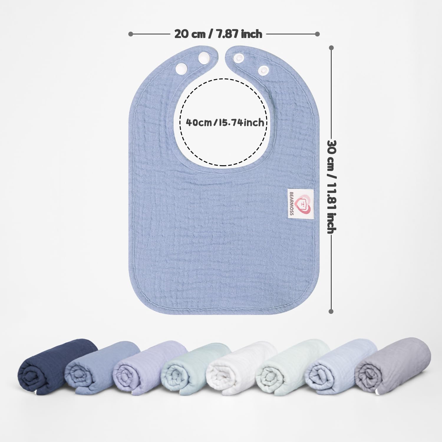 • 100% Cotton: Our Bearmoss muslin baby bibs are made with 100% cotton material that is soft and gentle for your baby's delicate skin. With muslin fabric, making them lightweight and breathable, also perfect for everyday wear.