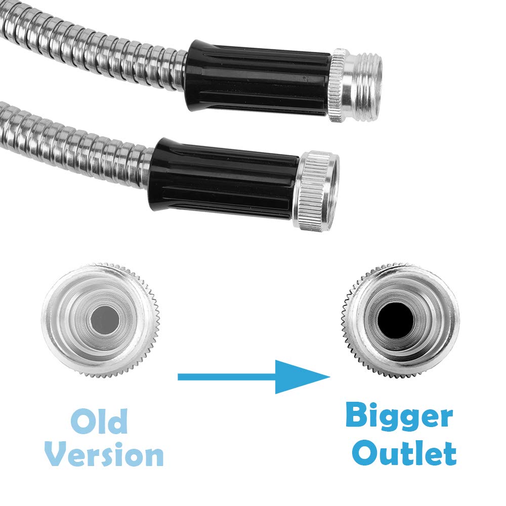 ✔️ Upgrade Version We increase the opening of our steel hose connector (bigger inner diameter than our older version and other metal garden hose on the market), so this no kink garden hose supports a higher water flow. Save your time and energy when watering.