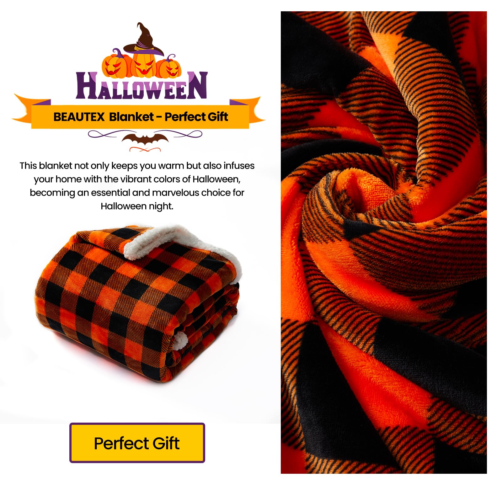 BEAUTEX Halloween Blanket, Sherpa Plaid Throw Blankets Fuzzy Fluffy Cozy Soft Throws, Fleece Flannel Plush Microfiber Blanket Halloween Fall Decor for Couch Bed Sofa(50" X 60", Orange)