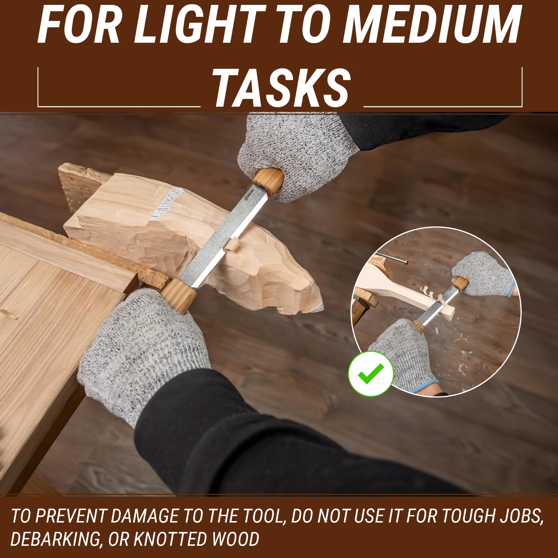 • Draw Knife Cutting Edge: very sharp, allows you to cut softwood & hardwood, durable enough to cut hard and soft woods. NOTE! The draw knife is designed to work with wood without bark or knots!