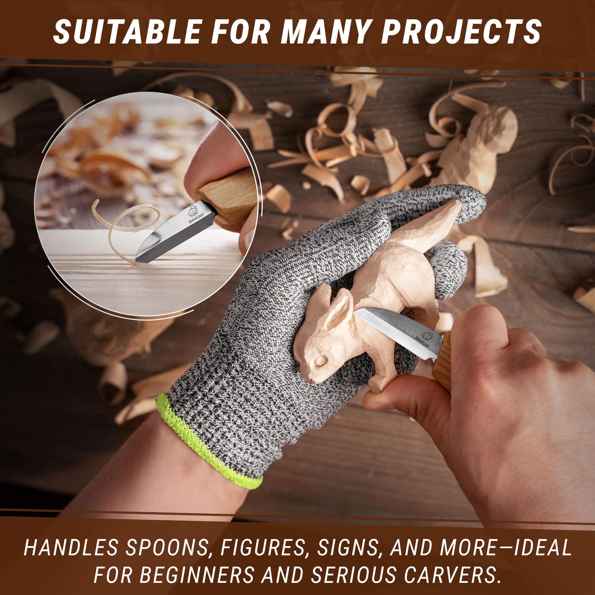 • Whittling Knife Ergonomic Handle: knife wood carving handle is made of hardwood oak and finished with natural linseed oil. It allows a long period of comfortable wood carving without hand fatigue.