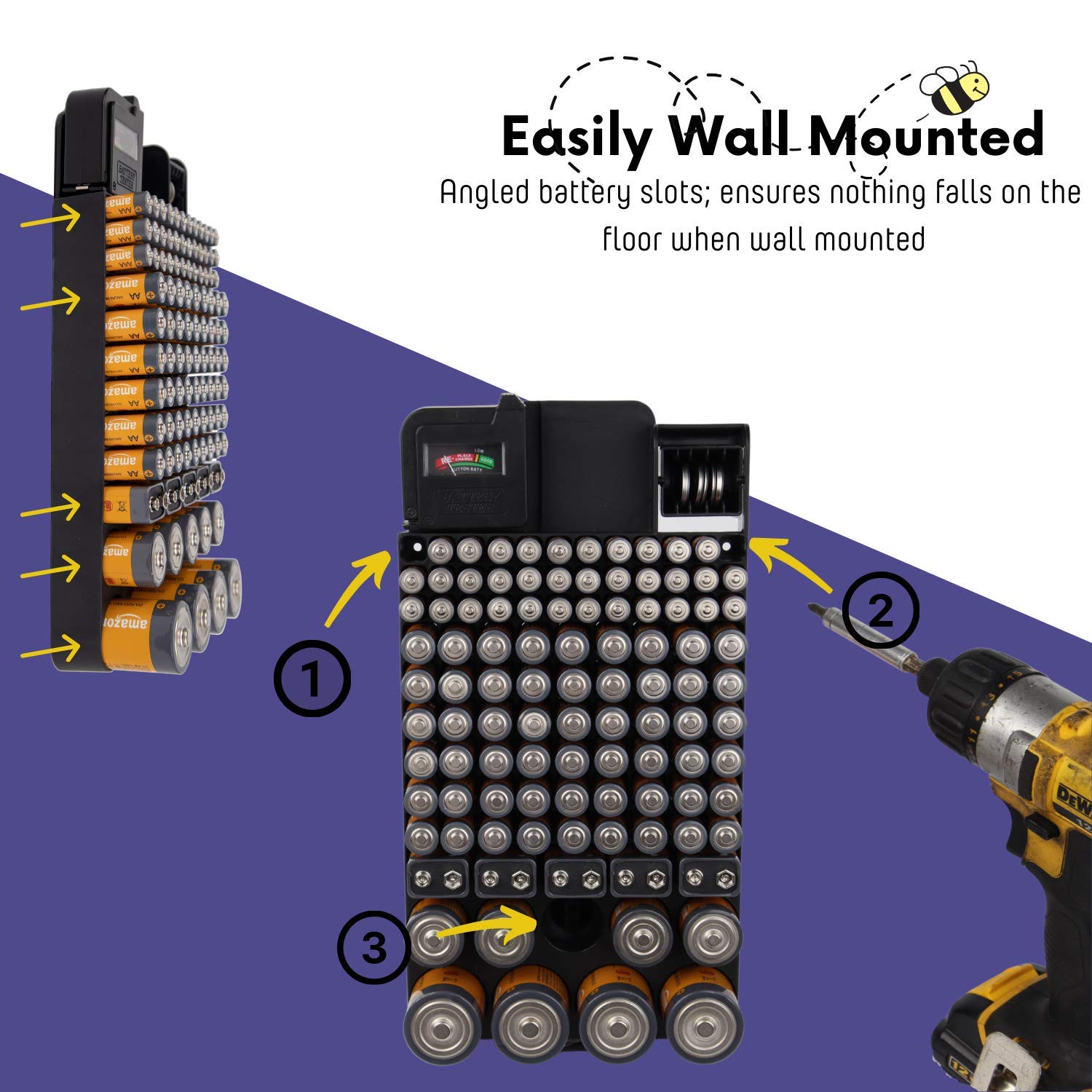• ๐Ÿ”‹ KEEP IN A DRAWER OR MOUNT ON A WALL โ€“ This battery organizer includes hardware so it can be easily mounted on a wall. Battery slots are slightly angled to keep batteries upright when mounted.