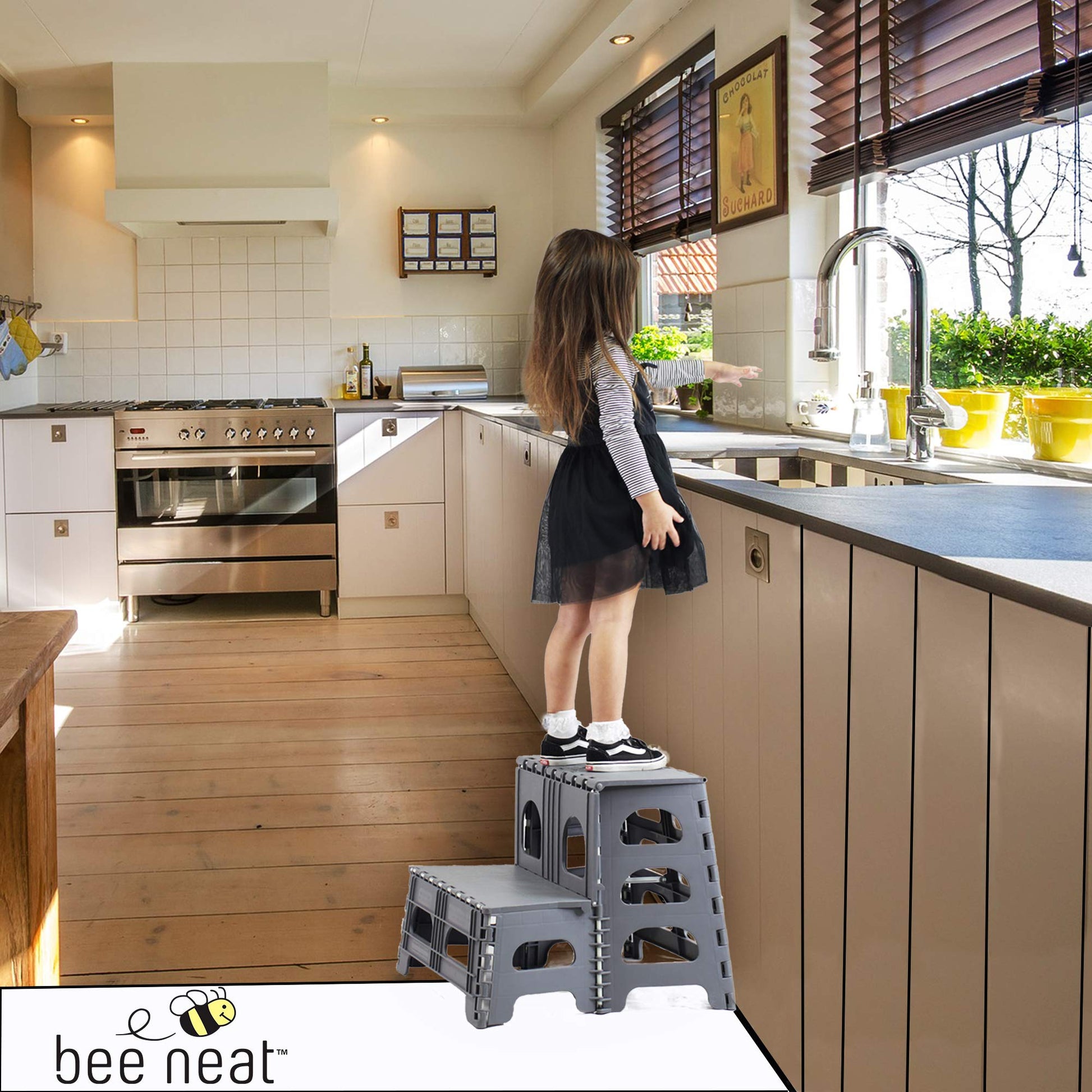 Bee Neat Folding 2 Step Stool for Adults, Kids, Toddlers - Collapsible & Foldable Step Ladder for Kitchen, Bathroom or Bedroom - Non-Slip & Wide Stepping Stool Supports 200lbs - Gray
