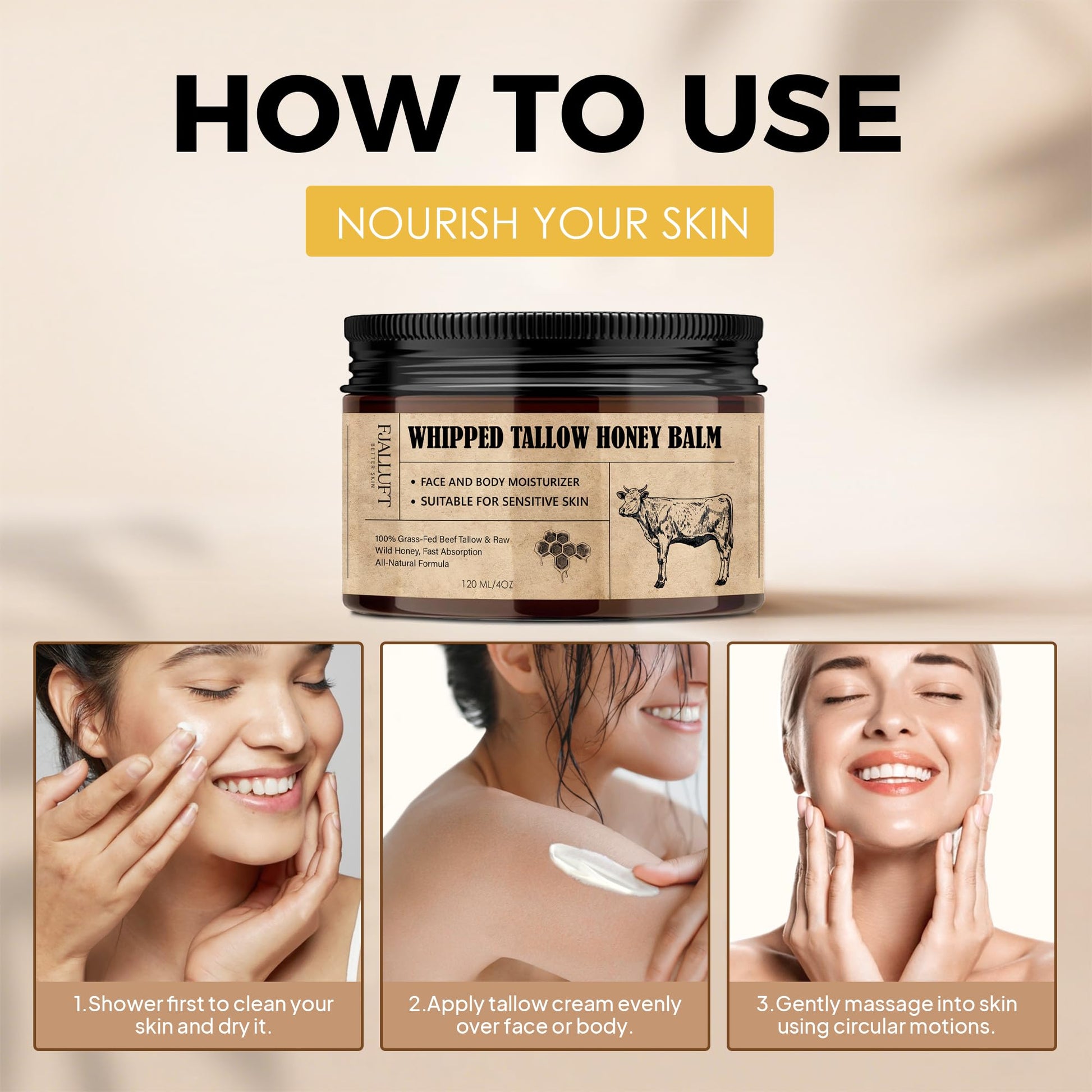 • 100% Natural, Chemical-Free Skincare for Face and Body: Made with pure cow tallow for skin, honey, and olive oil, our formula is free from artificial fragrances — perfect for natural face moisturizer lovers.