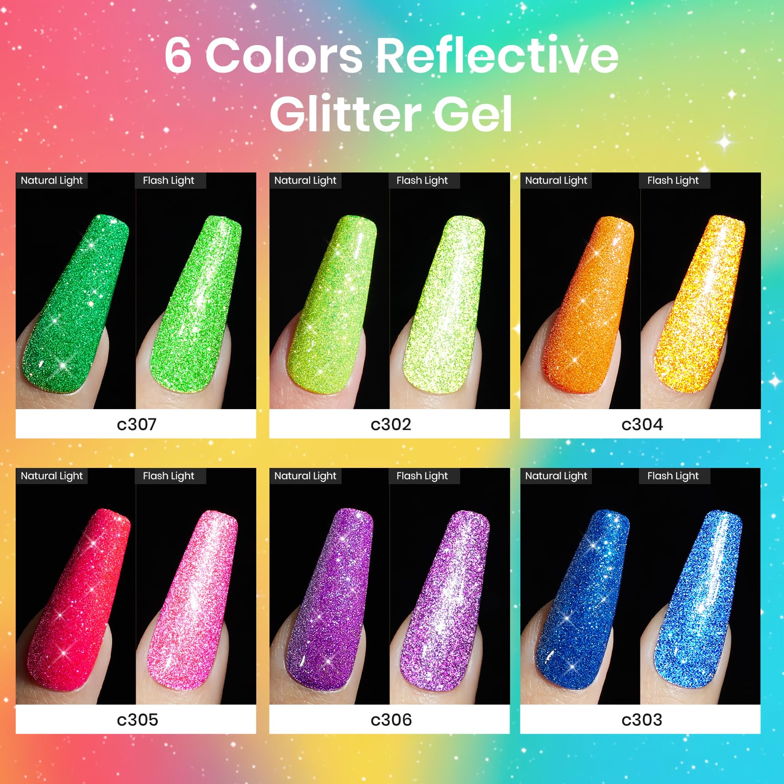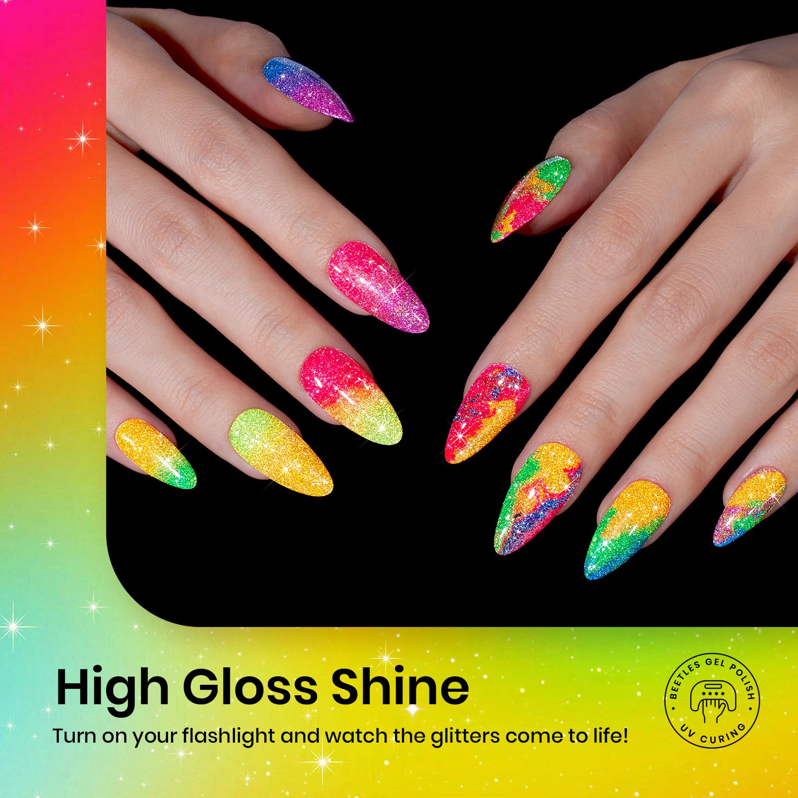 Beetles Glitter Gel Polish Set, 6 Colors Reflective Glitter Nail Polish Set Nails Gel Blue Hot Pink Purple Soak Off Uv Led Sparkly bright Colors Halloween Nail Polish Kit Gift for Women