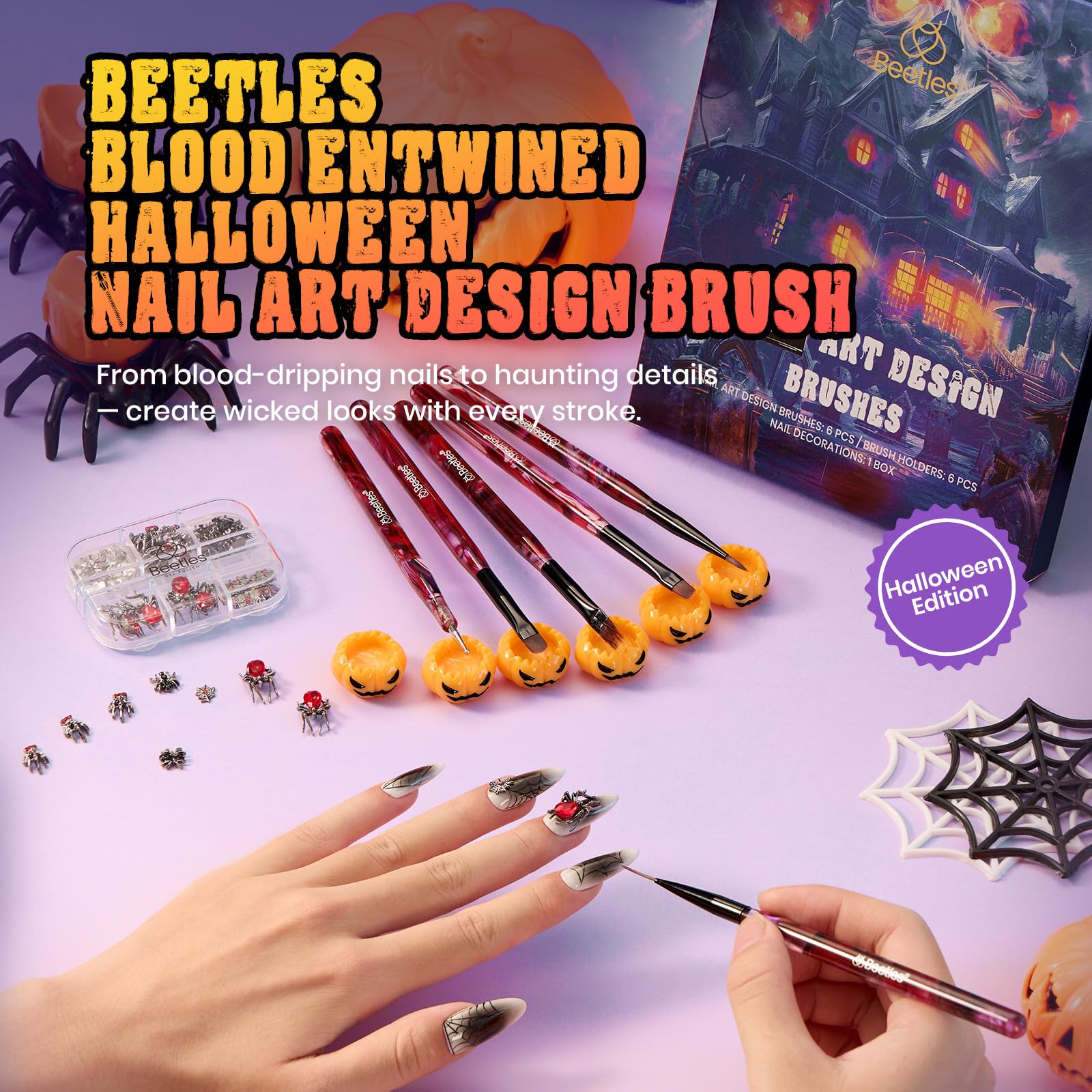 Beetles Halloween Nail Art Brushes, Blood Entwined Nail Art Pens 6pcs with Pumpkin Palette Holder Halloween Charms Manicure Design Dotting Tools Draw Liner Gradient French Brushes DIY Nails Supplies