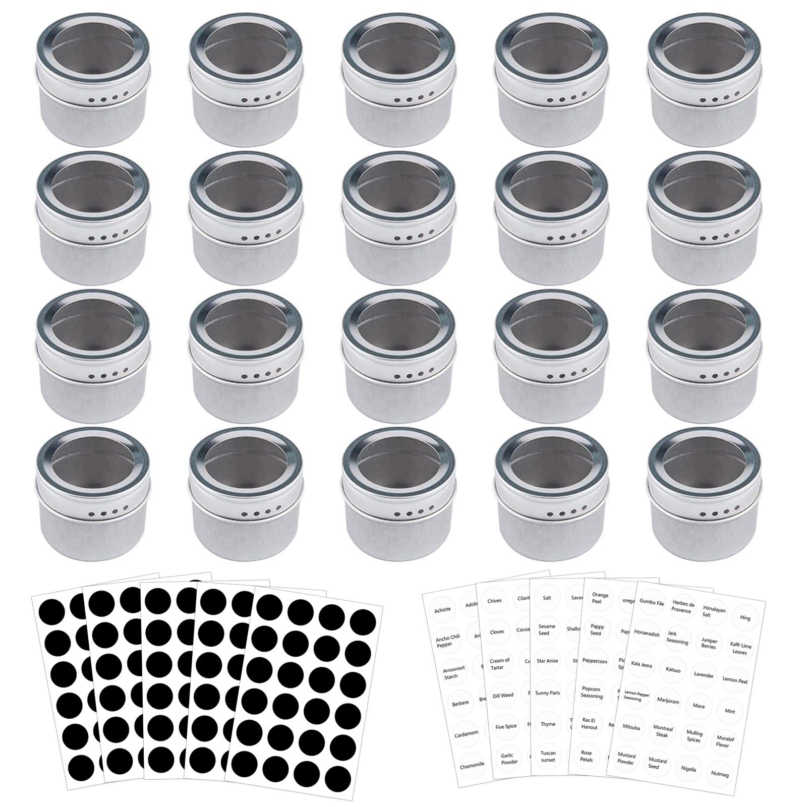 Bekith 20 Pack Magnetic Spice Tins Storage Spice Containers, Clear Top Lid with Sift or Pour, Magnetic on Refrigerator and Grill, 240 PVC Spice Label Set