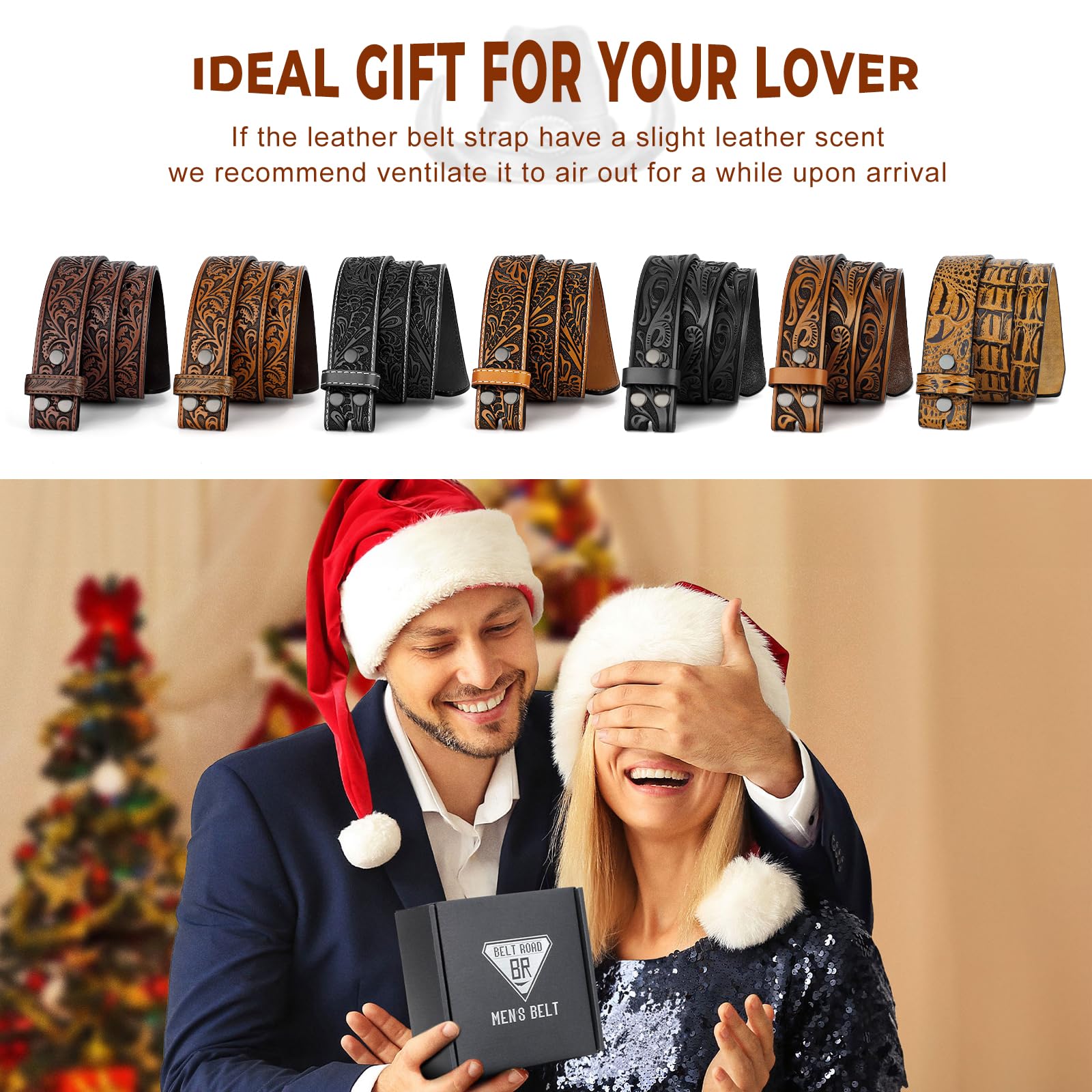 • UNIQUE CARVING PATTERNS: High quality mens western leather belt strap, exquisite oiledge craft, fit and comfort. Western-inspired leather belt without buckle featuring embossed pattern adds the perfect touch to any pair of jeans, pants. Cowboy cowgirl belts for men and women.