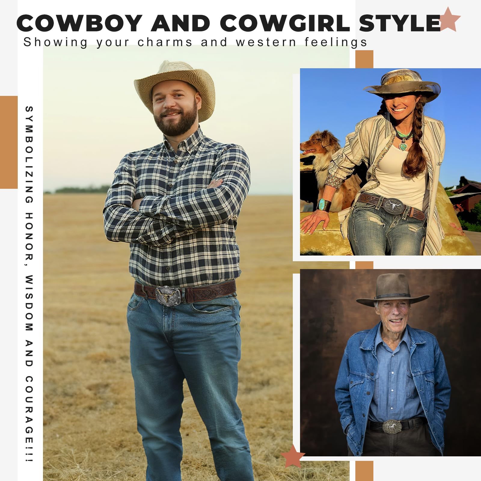 • Unique Carving Patterns: High quality mens western leather belt, exquisite oiledge craft, fit and comfort. Western-inspired leather buckle belt featuring embossed pattern adds the perfect touch to any pair of jeans, pants. Cowboy cowgirl belts for men and women.