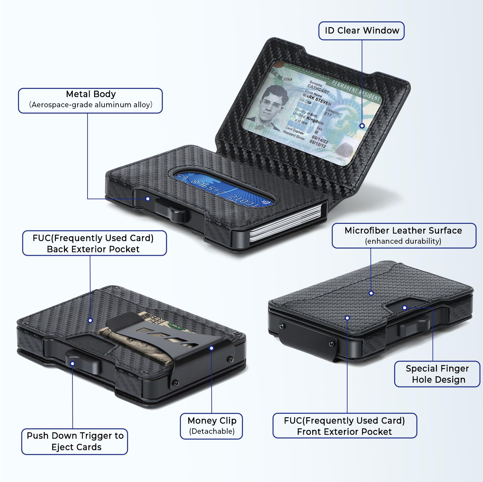 BESSIO Slim Wallet for Men - Minimalist Mens Wallet with Money Clip, Aluminum Pop Up Card Case and Leather Slots Credit Card Holder RFID Blocking Wallet for Men with Gift Box (Carbon Fiber)