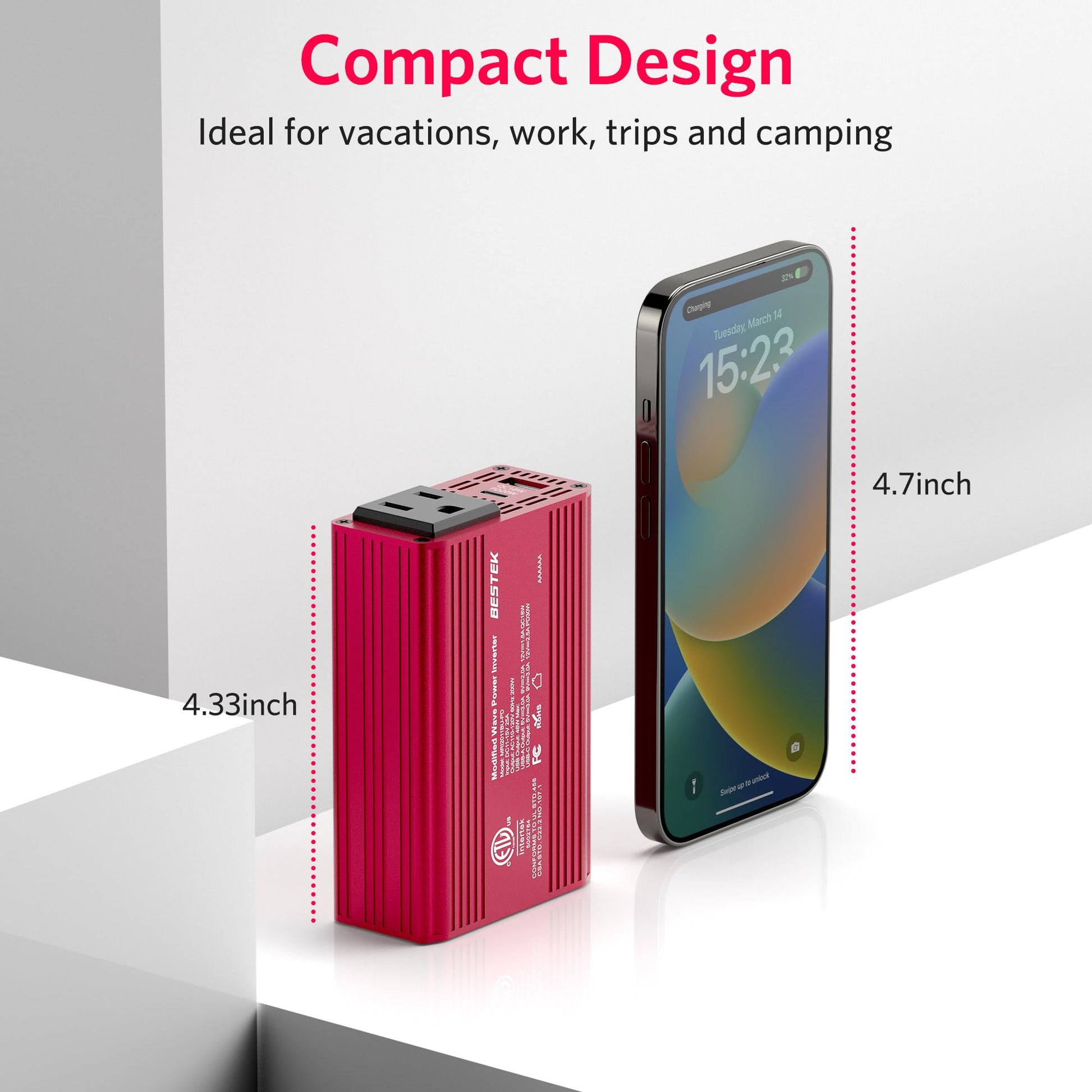 • BESTEK ADVANTAGE: America's leading power inverter brand. Provides 200 Watts continuous DC 12v to AC 110v power inverter featuring PD 20W&QC 18W USB ports, 1 AC outlet, and a 24-inch cable with cigarette lighter plug.